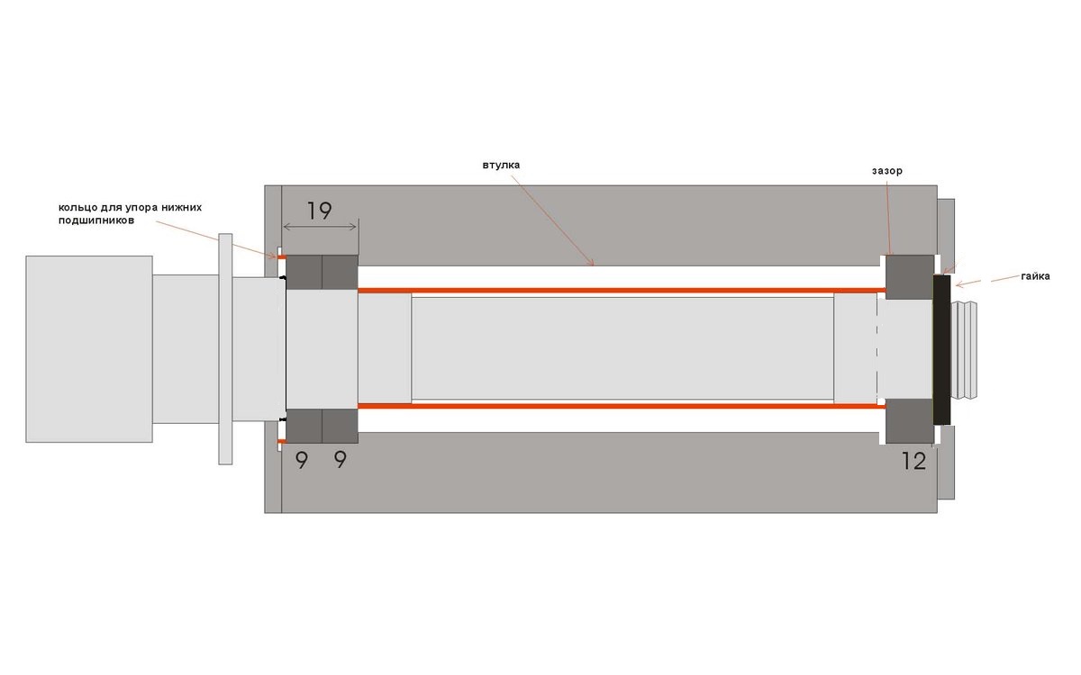 точка в том смысле, что зазор заднего подшипника с обеих сторон? я так и планировал втулку чуть длиннее сделать, чтобы подшипник не упирался внешней обоймой.