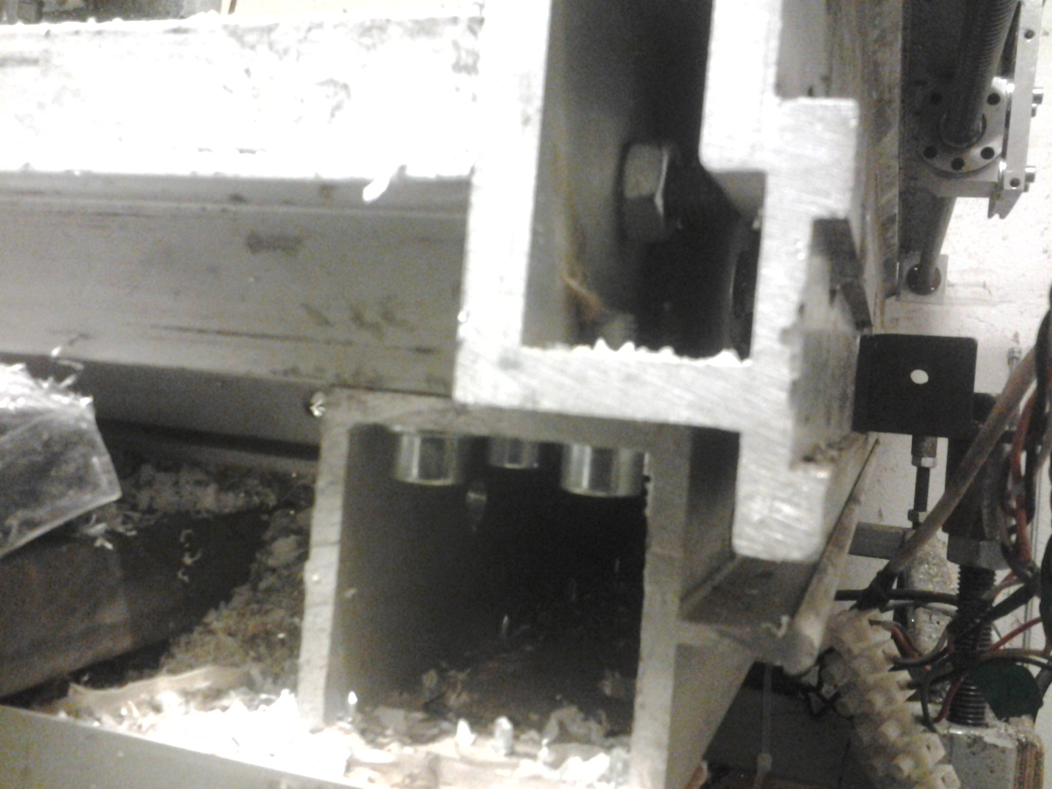 К боковине снизу привинчен профиль 60/60/5мм винтами м8. Этот же профиль привинчем такими же винтами к профилю стола. По 4 винта на каждый профиль стола. Всего их 8, размером так же 60/60/5мм. Сквозь каждый профиль стола проходит и втягивает боковины портала, шпилька из арматуры с резьбой м10 .