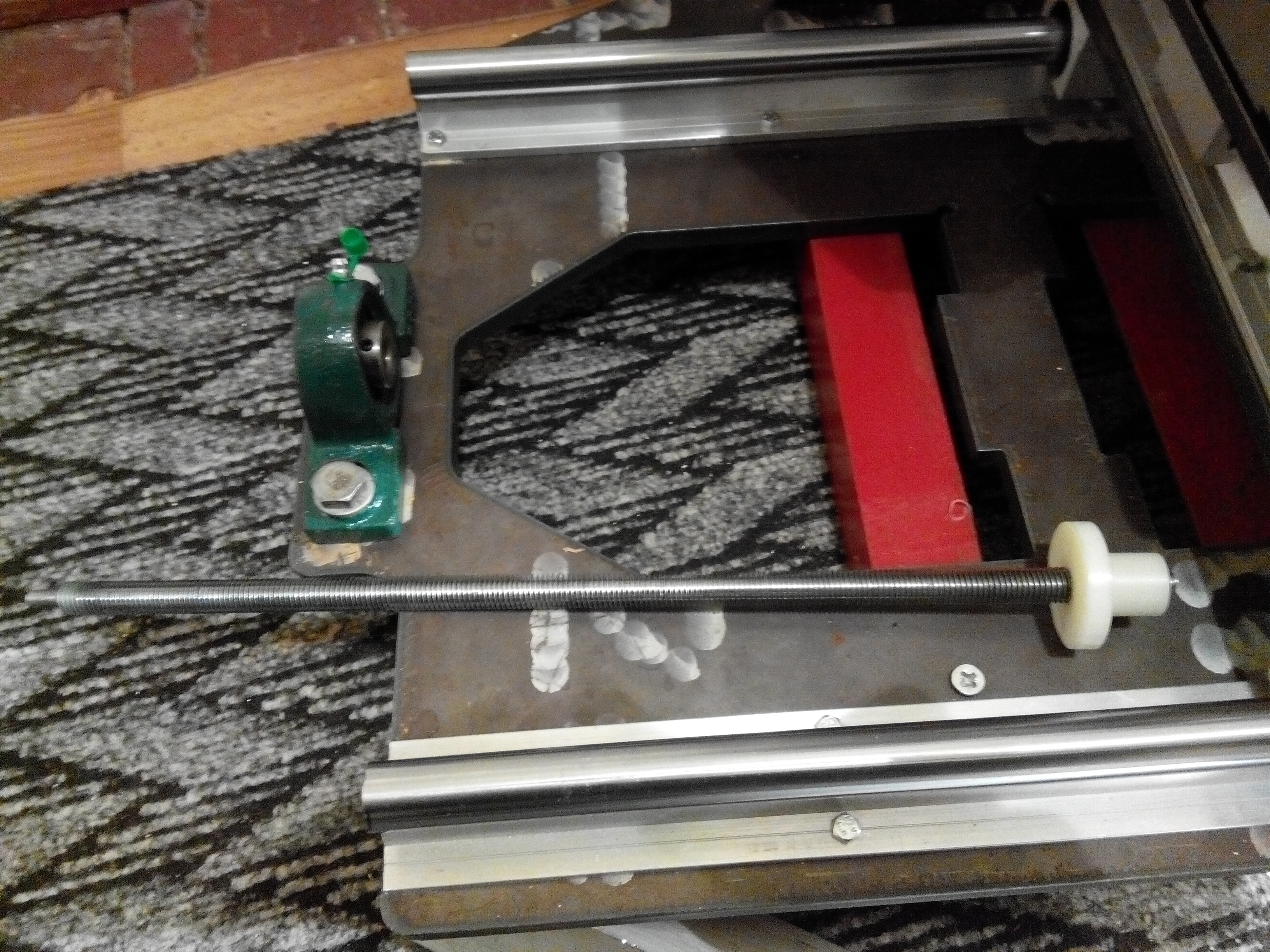 Колхожу дальше. Установил еще на одну ось винт с гайкой. Удалось убрать перекосы и винт легко крутится руками. Надо так же переделать Z, а то закусывает слегка. Последний винт с гайкой ждут своего времени. Гайки не разрезал, марафет не наводил, так как вскоре хочу установить трапецию и это временный вариант. Стол пока не выставлял, а только прихватил двумя болтами, чтоб крепление гайки зажать.
