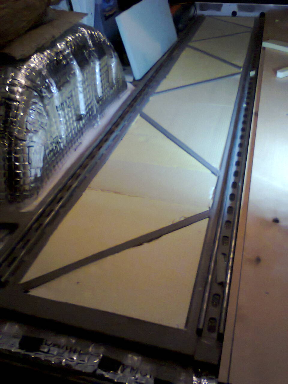 При таком куске работы экономить на спичках смысла не было. Фанера водостойкая. Испытано. Воду впитывает разве что поверхностный слой, остальная стоит. За счёт рамы с подкладками полистирола и фанерой пол в машине заметно теплей. Периодически путешествуем по Украине, иногда ночуем в машине, да и на участок езжу, тоже в машине ночую. Стелим на пол. Спать комфортно и снизу не холодит. Кстати, не попали некоторые фотки в кадр, лишь одна, там где боковые прорези в некоторых элементах рамы. Смысл такой: все трубы рамы соединенны между собой отверстиями. Спереди рамы сделал два входных отверстия. Туда будет подсоединён воздуховод от главного отопителя. Сзади выход в стойки авто, к штатным решеткам, которые в грузовом варианте не задействованы. В общем, пол с подогревом будет :) На общем фото рамы по углам видны круглые отверстия под это дело. Пару фоток добавлю. На них всё видно. Сама рама прикручена к кузову к штатным местам для силового крепления грузов. Под уши были сделаны проставки и установлены родные петли крепления грузов в те же места, где прикручена рама. Ни единой дырки в кузове не сделал