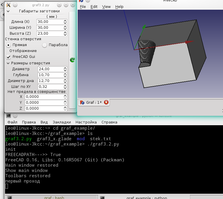 Пример, как это может работать по просьбе nkp в архиве. Надо в файле graf3.2.py в 17 сроке корректно указать путь к библиотекам FreeCAD.