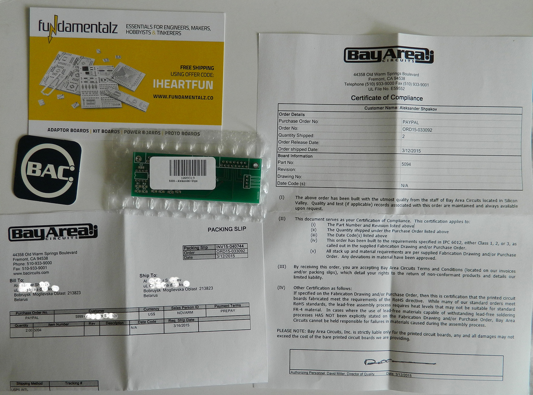 Заказывал чисто для интереса. Ради процесса. Развел в DipTrace и там же нажал заказать. И вот результат. По заказу должны были изготовить 2 шт. (минимальное количество), а выслали почему-то аж четыре.