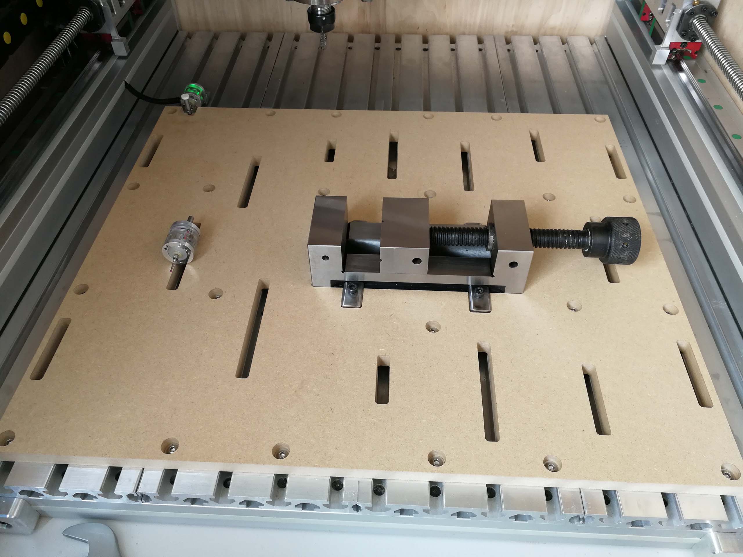 Пыльнул профиль. Прикрутил заранее сделанный рабочий стол из МДФ. Прошелся по нему на 1 десятку. Закрепил и отъюстировал датчик длины фрезы. Установил по индикатору тиски. Выставил шпиндель. Осталось кабинет доделать.