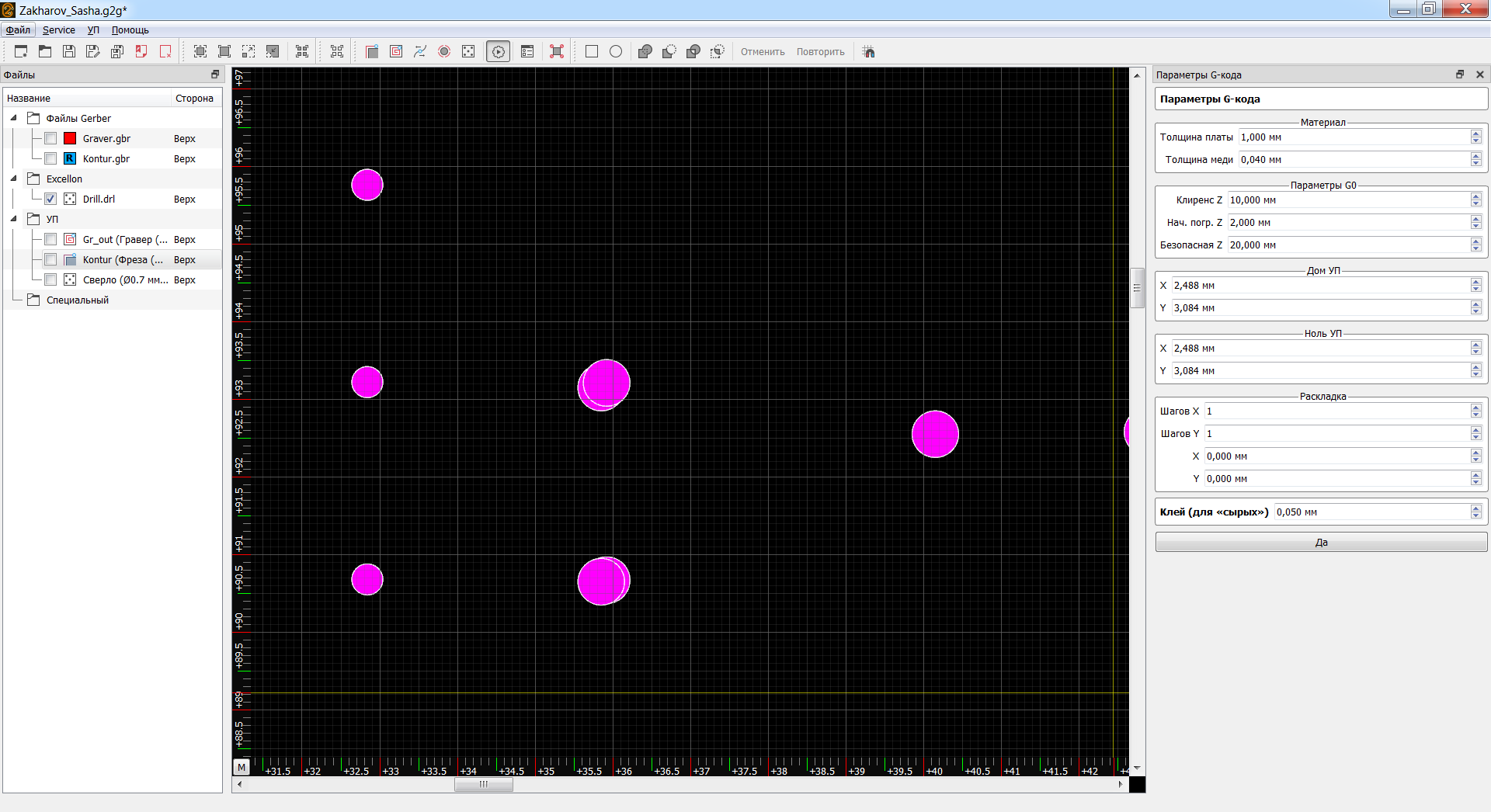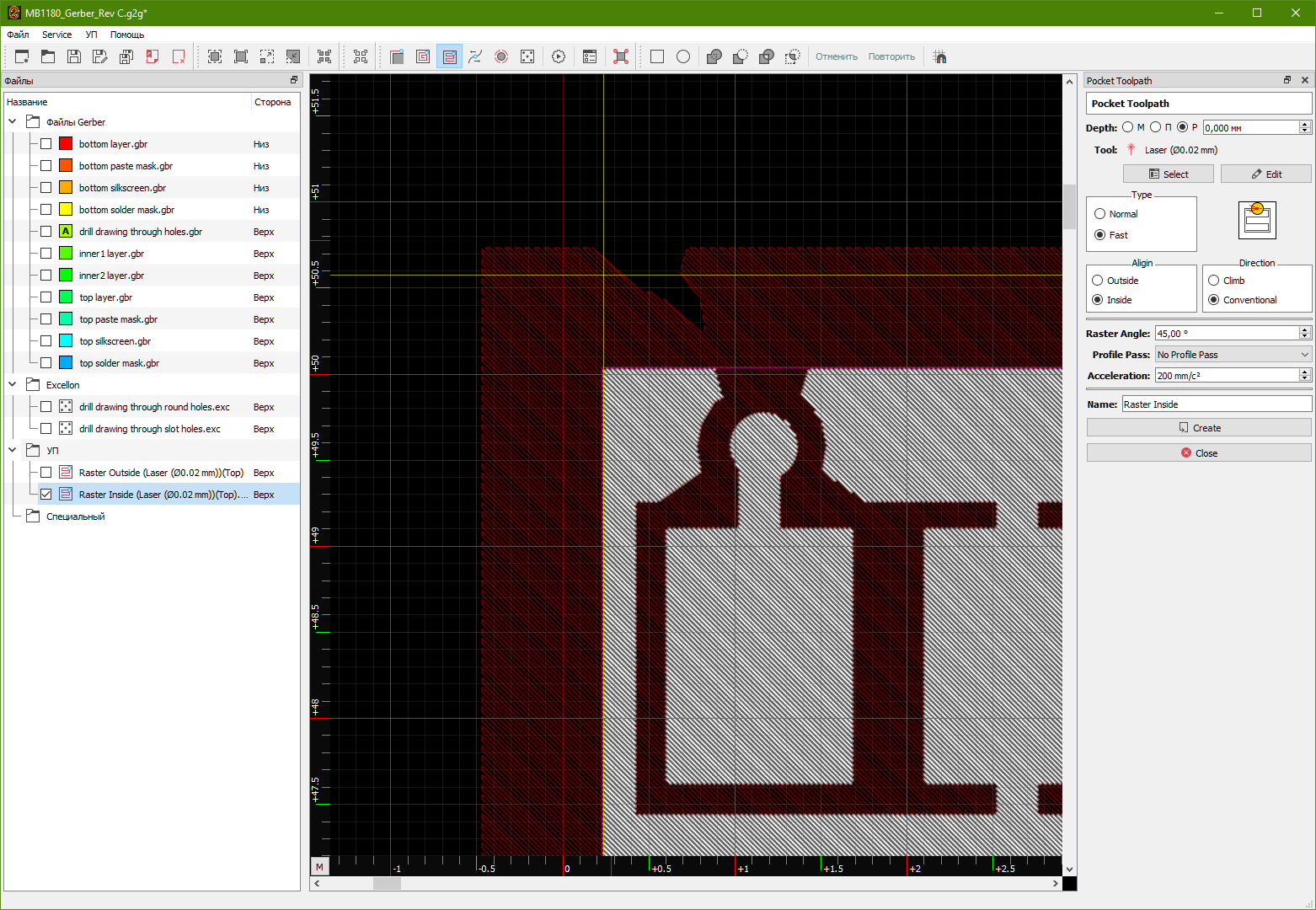 Если хотите ограничить зону выборки то контур платы тоже нужно добавить на слой меди.Так как тут два контура то делаем две УП, а затем сохраняем их в одну (3)Vlad1953 писал(а):Что то не получается сделать выборочную гравировку в кармане. Может не догоняю? Выкладываю скрины из программы. Две платы объединил в Sprint Layout. Поясните уж непонятливому, плиззз!