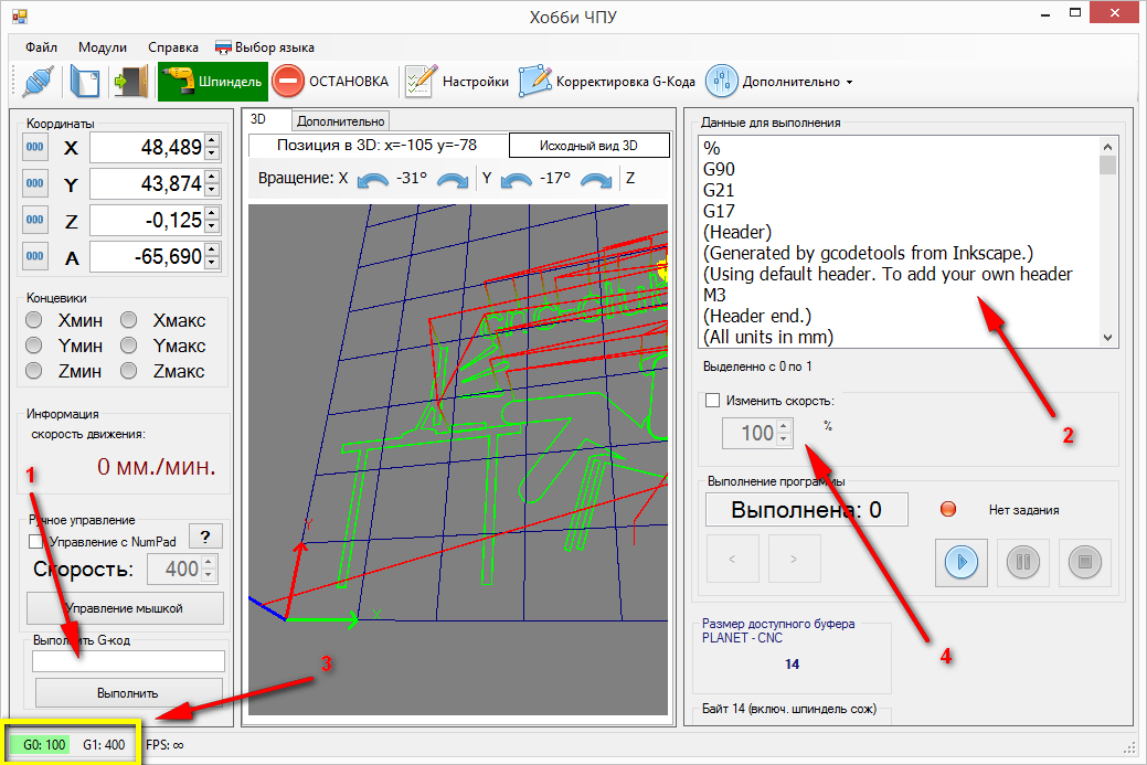 В случае выполнения G-кода из файла/буфера, в котором нет команд G0,G1 c Fxxx, т.е. нет информации о скорости выполнения, будет применяться та скорость которая выделена зеленым цветом в пункте 2.