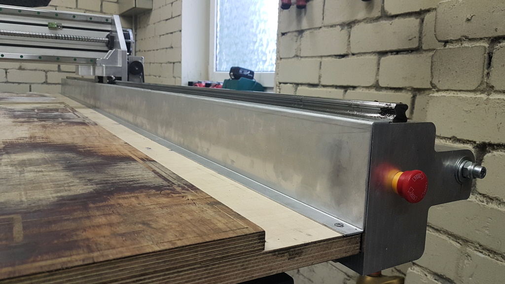 Прикрыл бочины швеллера алюминиевой накладкой, внутри провел кабеля, кнопку Е-СТОП, разъем для подключения 4 поворотной оси, разъем датчика высоты инструмента.