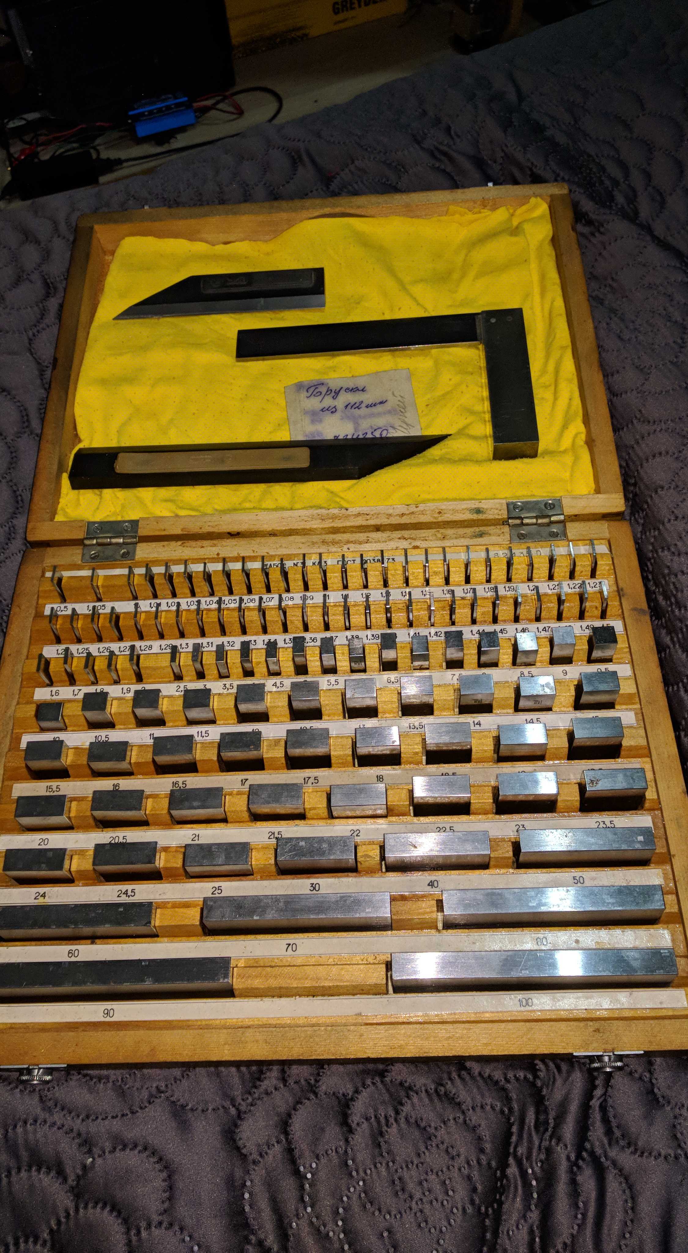 Я брал №1, но вроде есть еще более полный. Он включает плитки от 1 до 100 мм. Можно получить любой размер с точностью примерно в 5 микрон (в наборе есть плитка 1.005). Еще класс важен - чем меньше цифра тем дороже, но и точнее выдержан размер. Более 3-4 плиток набирать обычно становится сложнее.Aidar писал(а):Посоветуйте какой набор кмд самый универсальный? И для сборки станка и для работы потом