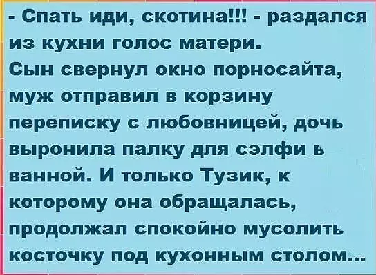 Муж не выдержал, подошел, тихонечко пальчиком постучал по голове и в ушко мне говорит: "Эй, тараканчики! Вы что, сдохли там? "