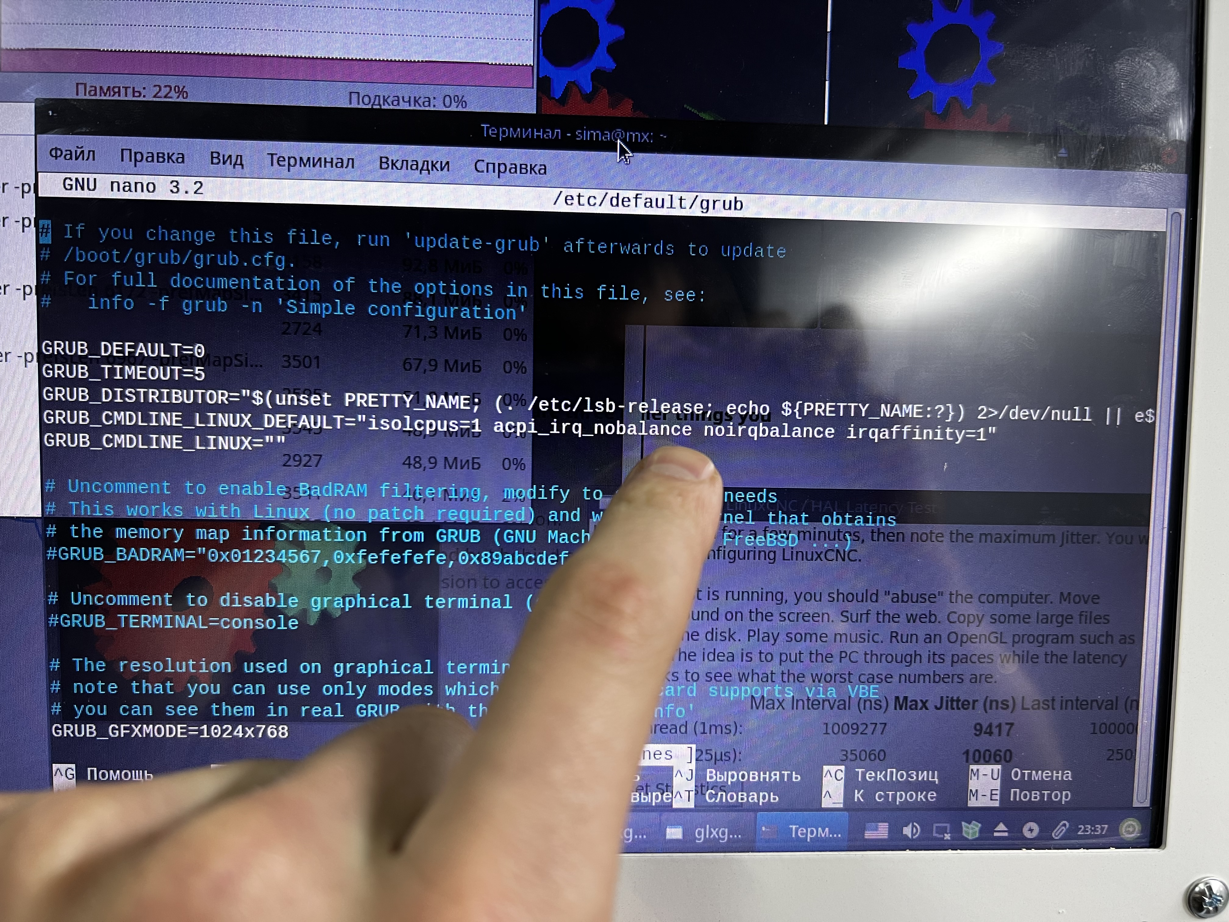 Я бы всё-таки для начала провеёл эксперементы с дистрибютивами.. родной 10 дебиан с linuxcnc.org, потом взял образ у чпу-технологий. Ну gmoccapy на axis заменил. Так-же даёт результат смена оболочки.. об этом уже писал в теме пару лет назад, когда 2.8 вышел.. смена xfce4 на lxde даёт незначительное, но всё-таки уменьшение джиттера на машине с lpt портом.. Может вообще имеет смысл откзаться от менеджера пользователей xdm, lightdm и прочих.. а прописать скрипты автлогина в терминале, после входа в систему - запуск linuxcnc под облочкой fluxbox или twm.