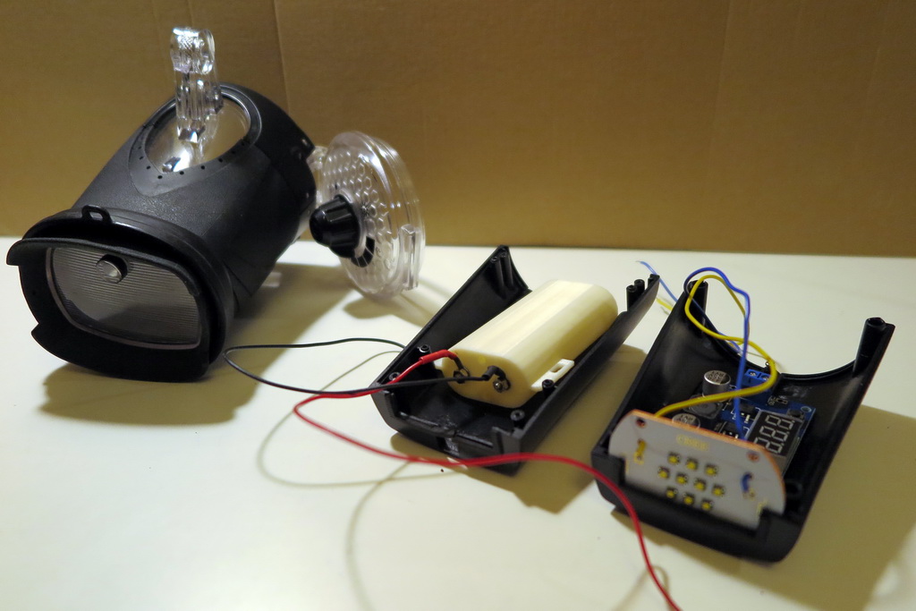 Блок светодиодов остервенело грелся, двух аккумуляторов оказалось недостаточно и сделать их извлекаемыми я не смог (пружинные контакты просто плавились).