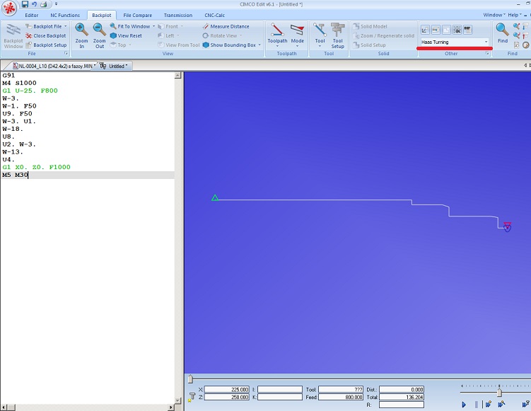 если в блокноте? то советую поставить CIMCO Edit, очень удобно, и траекторию видишь. твой код нормально отображается в режимах Fanuc turning и HAAS turning