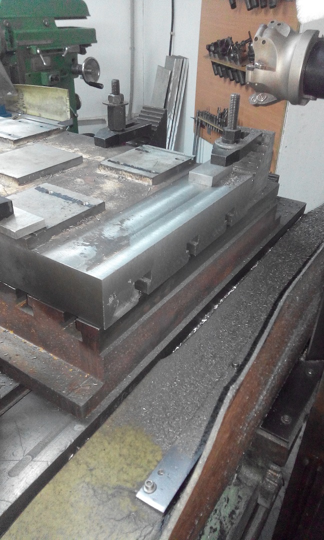 Сегодня промерил ширину стола и немного офигел. Похоже, что у исполнителя его сдвинуло при обкатке по ширине на 0.75мм. Т пазы между собой параллельны с хорошей точностью, а вот относительно длинных сторон стола полный бардак. Пришлось править фрезой Ф80, ходов станка хватило впритык. Еще начал сверлить отверстия под резьбу для крепления к кареткам. Решил отказаться от идеи сверлить стол насквозь.