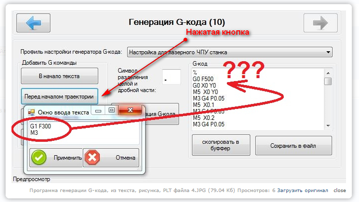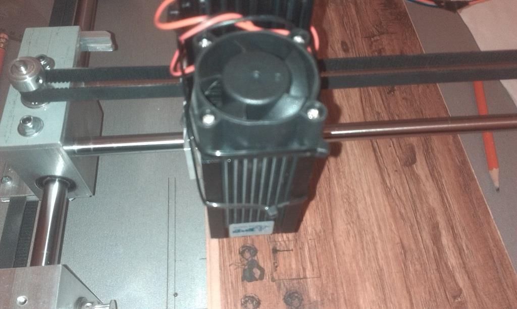 Материал: добор для дверей, оклеенный дубовым шпоном, покрытый наверное лаком. Лазер синий 2W, фокусировка до минимального диаметра луча. Тип обработки: рисунок, растр. Размер рисунка по программе 120х139мм, диаметр точки в программе 0,2мм, G1 2500, (на 3000 резонируют ШД). Время обработки всей картинки 2 часа 18 минут. Время прожига на точку: сначала 0,1 сек низ картинки (подгорело здорово), потом уменьшил до 0,05 сек - весь рисунок, можно ещё уменьшить и проверить результат. В целом все замечательно для первого раза, но появились предложения.