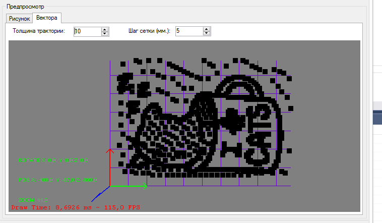 Уменьшать время прожига тоже не решит ситуацию. Как видно из фото, одиноко расположенные точки не пережженные и имеют диаметр меньше 0,2мм. Пережог наступает при наложении или соприкосновении одной точки на другую. Хотя в программе этого не видно (шаг сетки 1 мм):