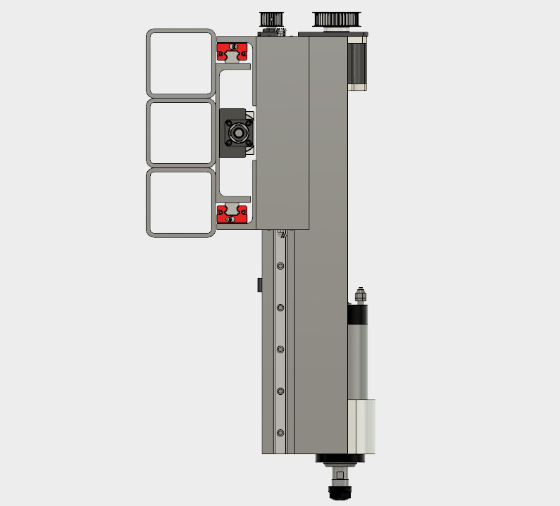 В последнем варианте были небольшие проблемы с жесткостью и ШВП был явно не на месте. Решил сделать иначе - http://a360.co/2aMFz7D. В ход пошли квадратная труба 100х100х6 и швеллер 20П. В тестах давил на гайку шпинделя силой ~50 кгс (500N). Фрезы при таких нагрузках уже ломаются.