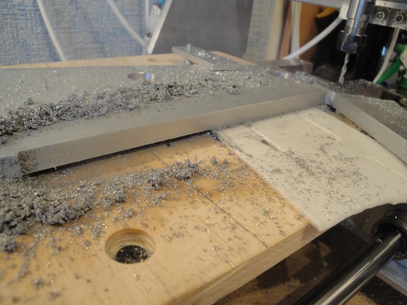 Более основательно попилил алюминий в "автомате". Шпиндель тот-же 500вт, фреза диаметром 3мм, подача 7-8мм в сек, съем 0.25мм за проход, те-же капролоновые гайки и "висячие валы". Временами съемы делал до 0.35-0.4мм, но шпиндель уже был в перенапряге. По личным ощущениям крутящего момента ему вроде хватало, но за его подшипники уже опасался. По-моему, если поставить профи-шпиндель (не хоббийный!) со взрослыми подшипниками, то "драть" по 0.5мм вполне уверено можно будет.