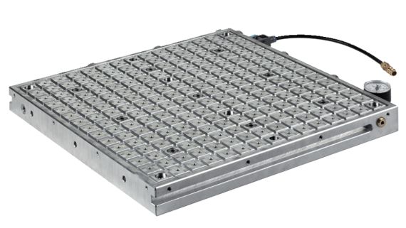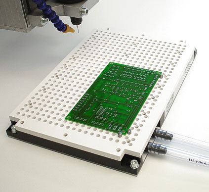 Вакуум предложил для обрезки, это по мне так самый удобный вариант держать детали которые по кругу обрезаются. а если через вакуумопроводящую подложку, то и потеря вакуума там не особо заметная при сверлении. посмотрите например ролики как Datron работает с вакуумными столами.