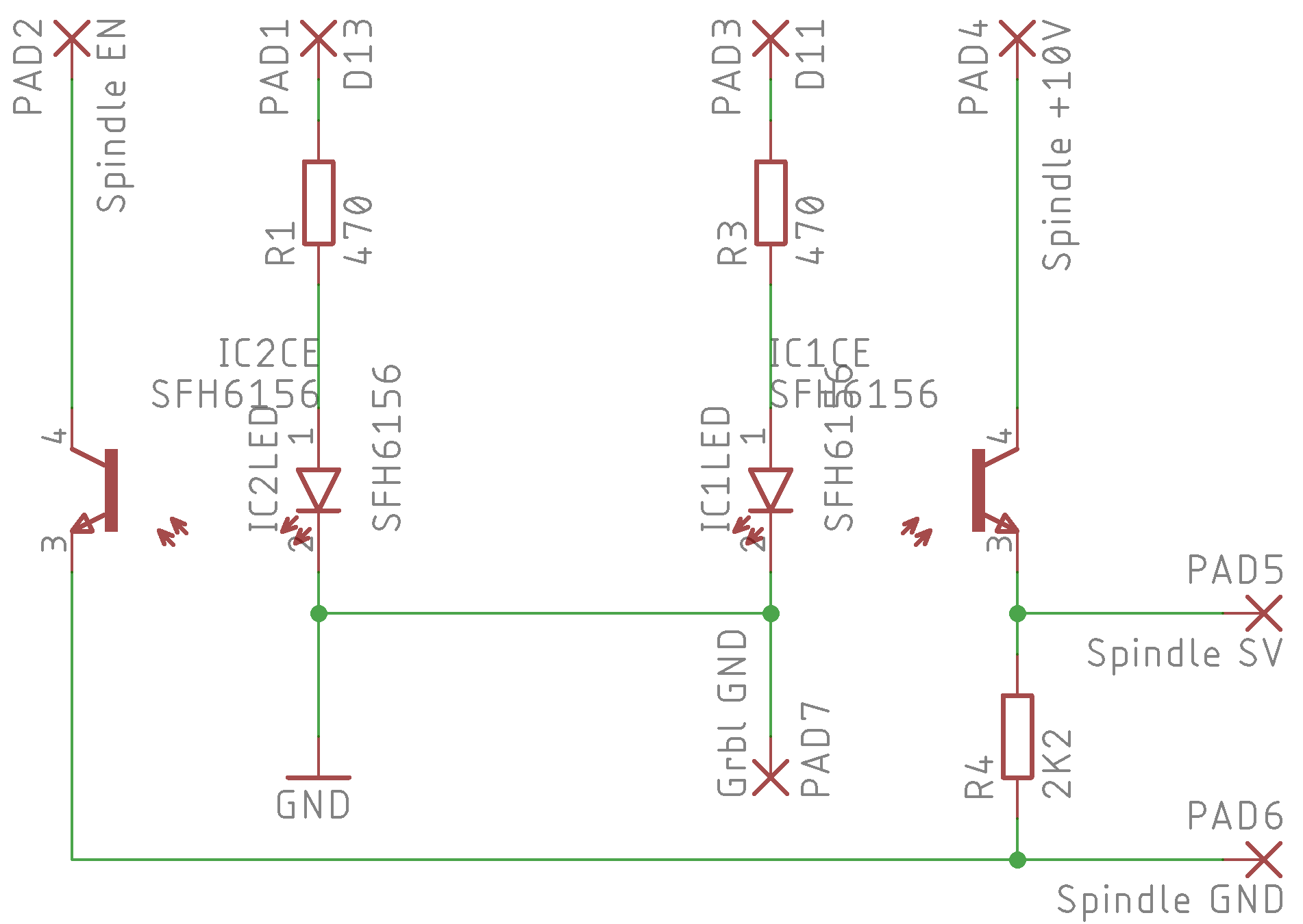 Я набросал схемку для управления шпинделем. Оптрон подойдет любой схожий по параметрам. Можно спаять на макетнице, а можно печатную плату изготовить. Монтаж элементарный односторонний. А можно печатную плату подшаманить так, чтобы она прямо на штырьках от обнаруженного Вами коннектора торчала (куда приходят цепи D11 и D13).