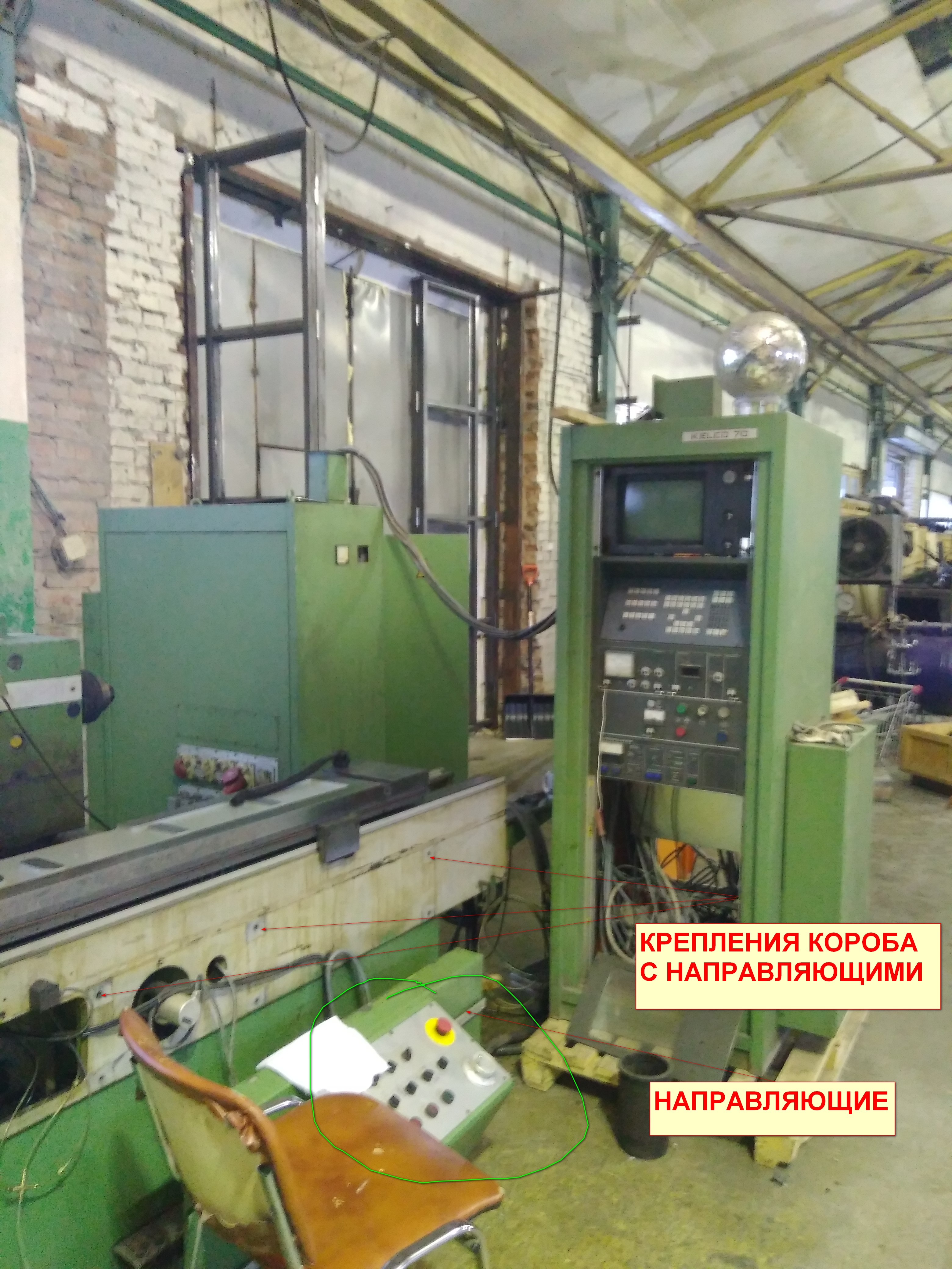 зеленый короб с направляющими жестко крепится на станок, а пульт ездит по направляющим свободно, и в зависимости от детали оператор его подвигает туда, где ему удобнее следить за процессом.