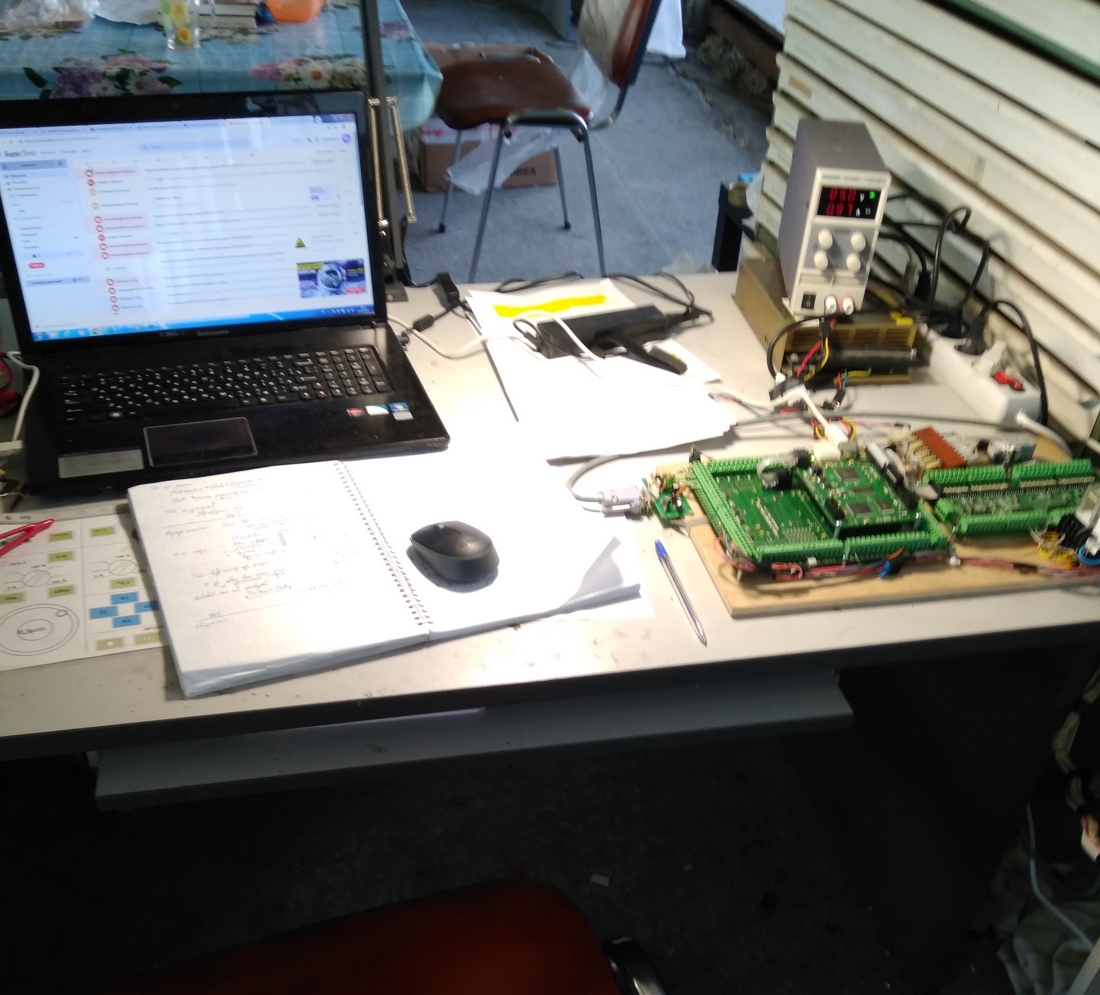 собран стенд - это собственно платы, ноут с программами, пульт, подключен двигатель Дельта в режиме Аналога и с его энкодера сигнал на ось.