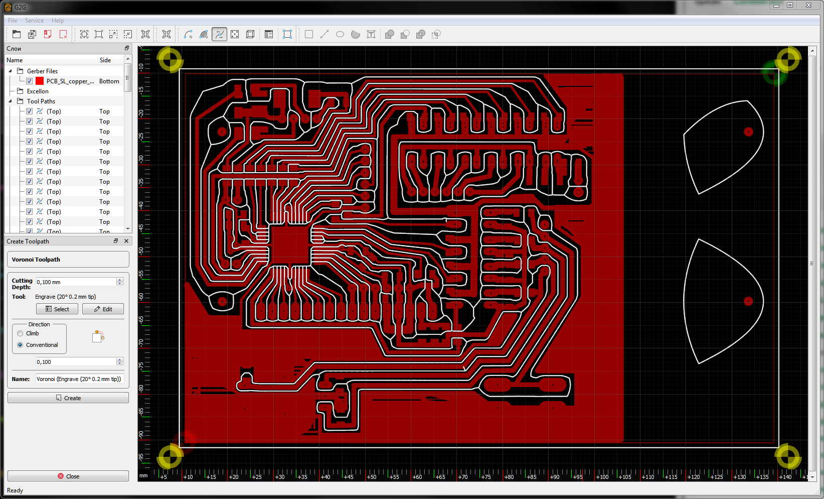 - я так и не понял как сгенерировать траекторию фрезеровки дорожек (можно кратко рассказать для нееопытных пользователей что и куда жать на русском в кнопке help)