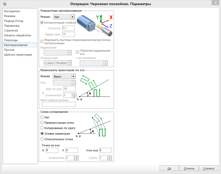А если просто нужно отзеркалить траекторию, то в главной закладке МОДЕЛИРОВАНИЕ жмем правой кнопкой на операции, выбираем ПРЕОБРАЗОВАНИЕ ТРАЕКТОРИИ, в появившемся окошке открываем закладку СИММЕТРИЯ