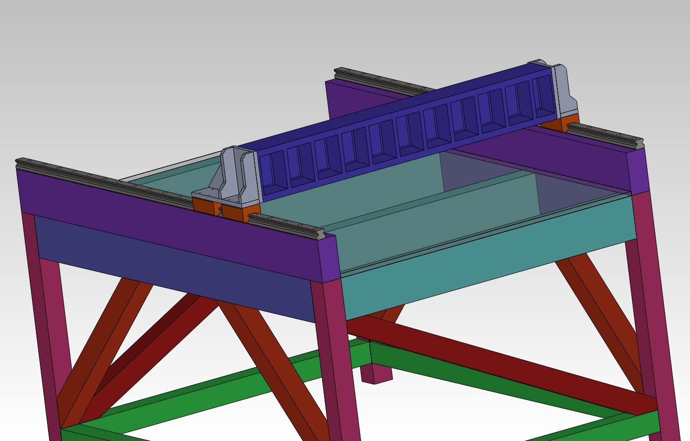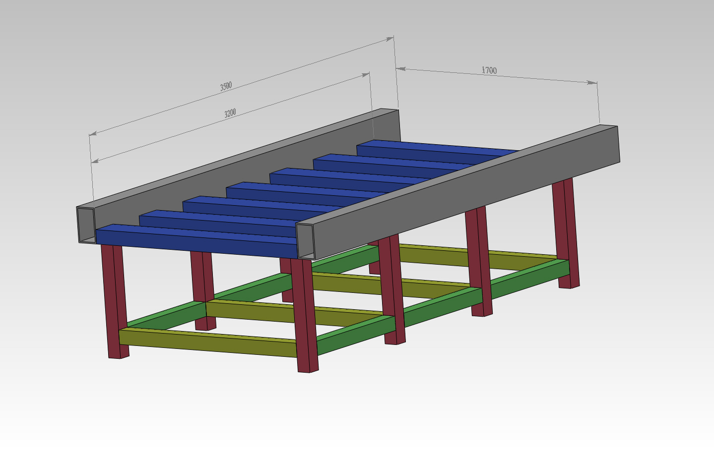 Концепция несколько поменялась! Появились финансы и заказчик требует увеличить рабочее поле до 1600х3100! высоту оставлю такую же 100 мм! Подиумы 250х150х10, сборка из трубы 200х100х5, ноги и перемычки 100х100х5