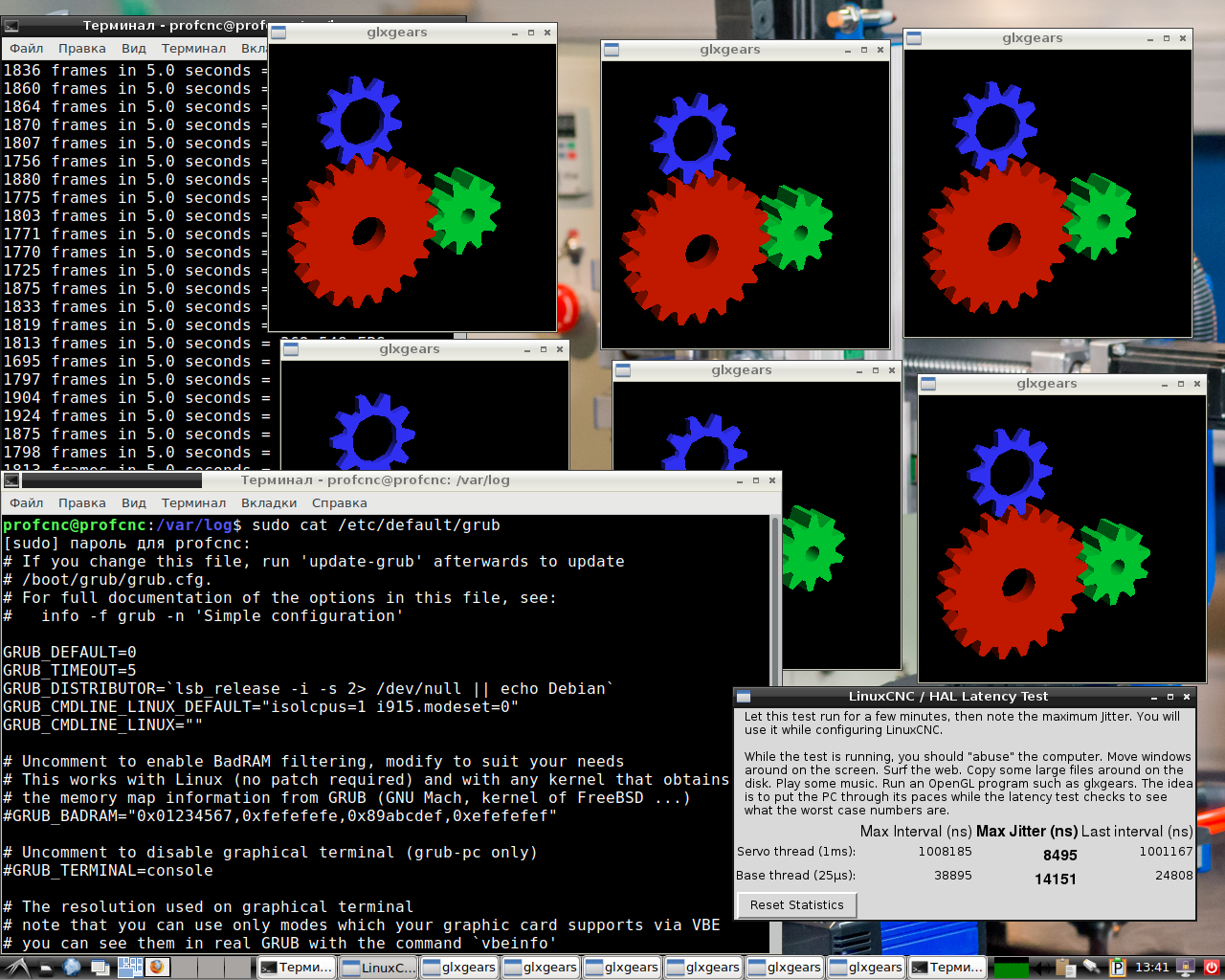 Ну и вот ещё "гирька" на весы в пользу новых ПК.. скрин с моего офисного ПК.. второй системой на винте 10ти летней старости стоит linuxcnc.. конфигурация и джиттер присутсвуют.. Отключил виртуализацию и изоляровал ядра 2,3. Интерфейс стал подтормаживать - видно по скачкам FPS. Но джиттер стабильный.