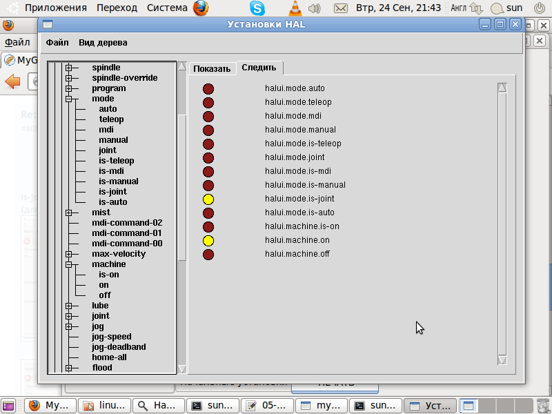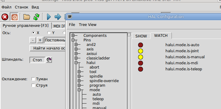 А вот halui.mode.manual в FALSE... И как это избежать? Почему именно в этой сборке станок не выходит в ручной режим?