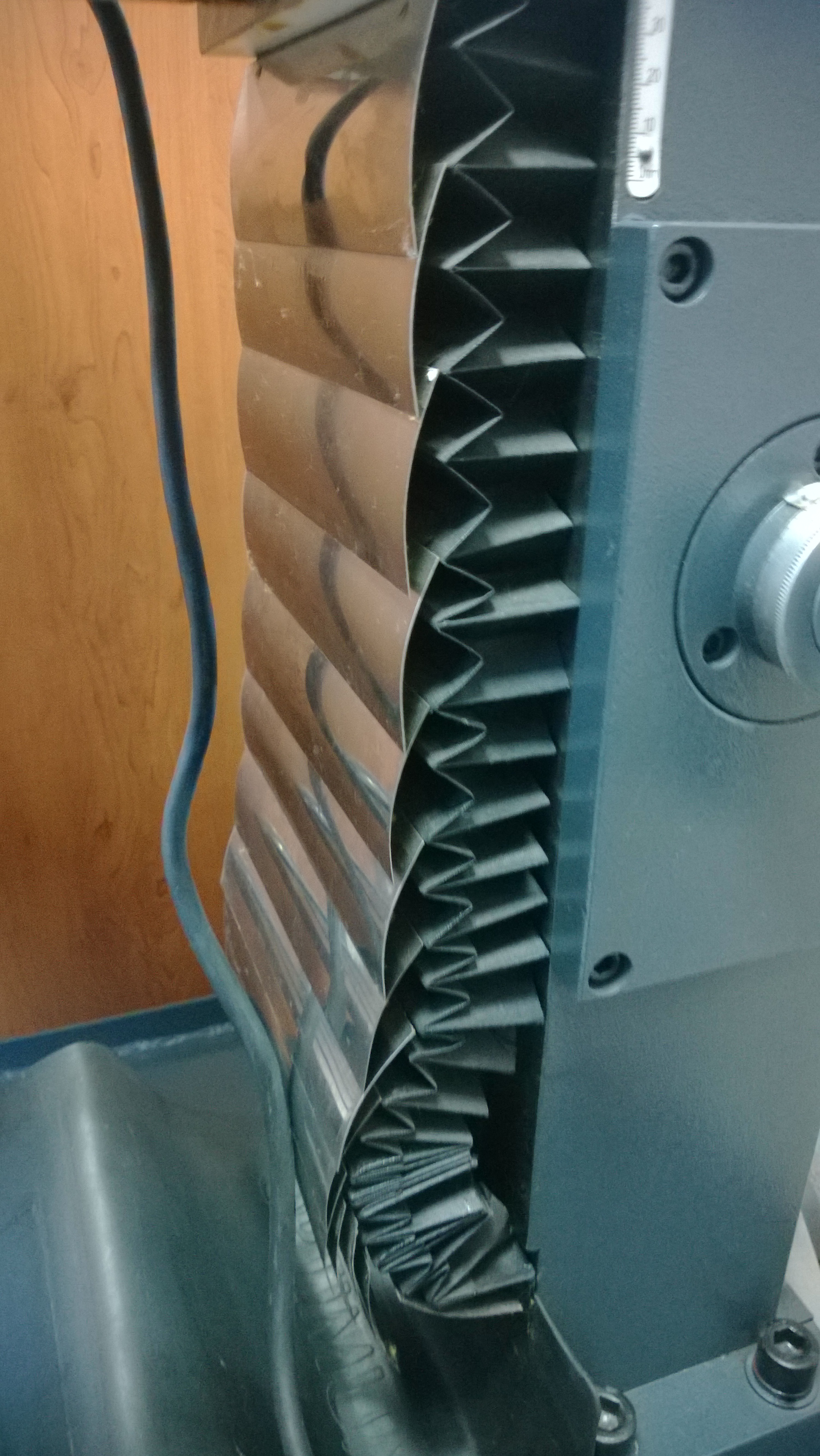 Гофрозащита на BF - редкостное убожество. Сделана из какой-то тончайшей ткани вроде болоньи. Местами армирована тонкой пластиковой пленкой. Боится масла и СОЖ. Чтобы не выпячивалась, предусмотрены пластиковые скобки, которые цепляются за ластохвосты, но ничерта не держат. Чтобы хоть как-то держала форму, пришлось применить степлер.
