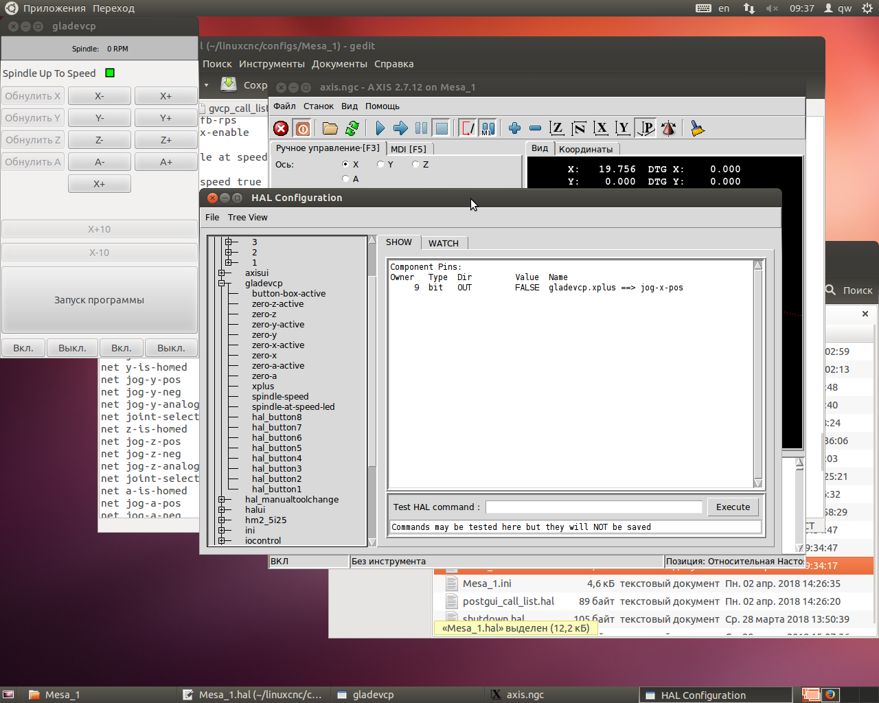 Удалил запись, вернул запись "net my-jogxplus halui.jog.0.plus gladevcp.xplus" в кастом.хал и запускаю с включенным питанием. При запуске программы проходит сигнал на шаговик, он дергается и потом программа вылетает со старой ошибкой. "Pin 'halui.jog.0.plus' was already linked to signal 'jog-x-pos'"