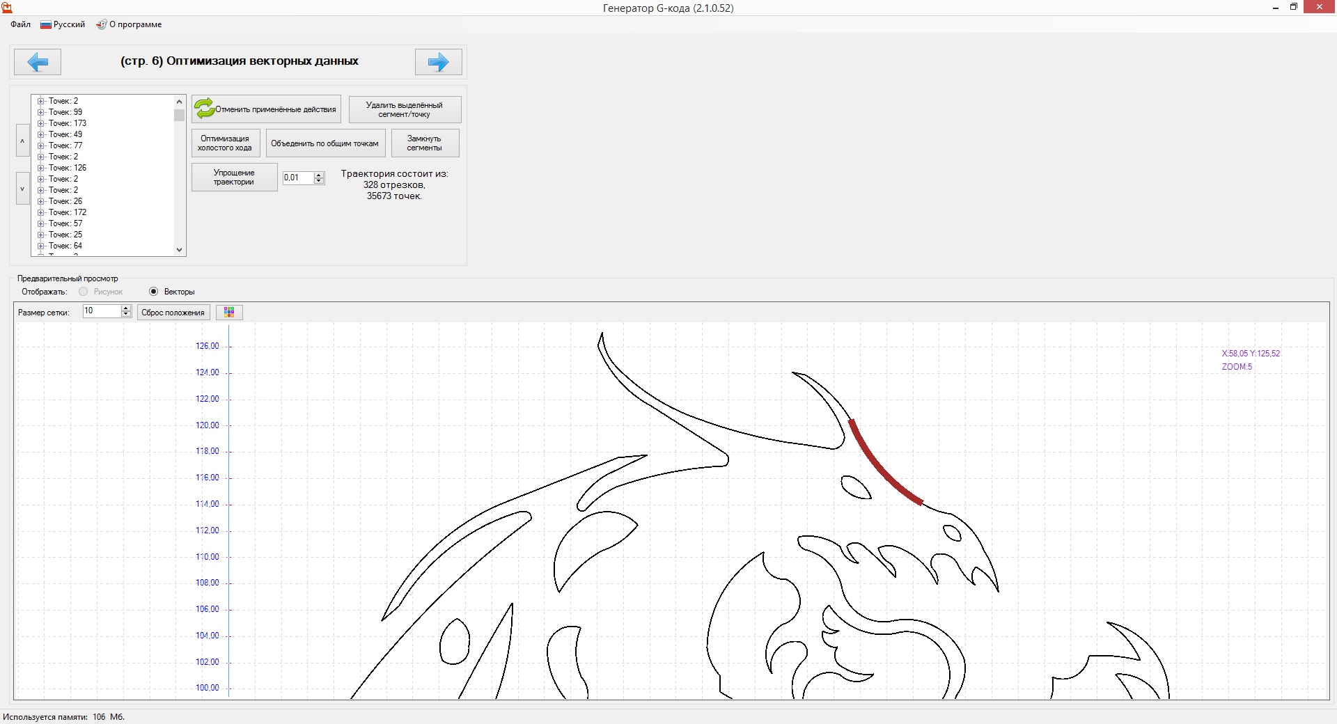 Превращаются в отрезки, т.к. не все станки понимают G2 и G3, и в данном примере промежуток размером менее 10мм. содержит 173 точки, что очень сильно снижает скорость движения. И к сожалению алгоритм оптимизации работает не всегда корректно, т.к. пока используется чужой алгоритм, т.к. пока не дошли руки переписать на свой...