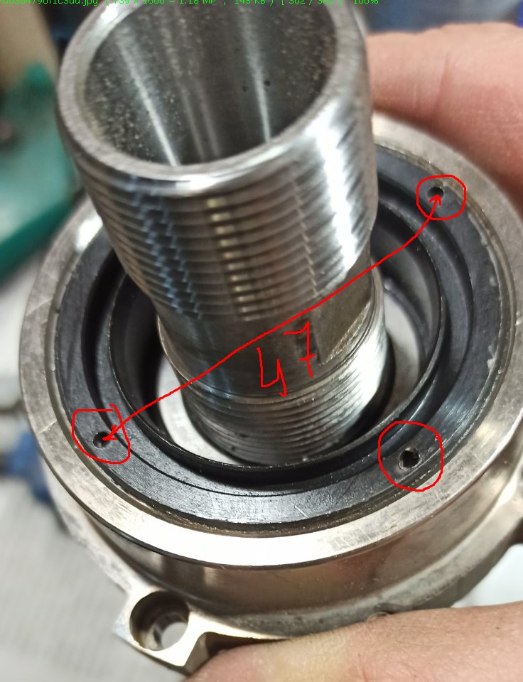 А вот к нижним добраться пока не могу. Кто как делает ключ для выкручивания этой черной прижимной гайки нижних подшипников? Или где то есть готовый ключ? В отверстия входит сверло 2мм, расстояние между ними по диаметру примерно 47мм. Подумалось - может рассверлить эти отверстия для ключа хотя бы до 3мм?