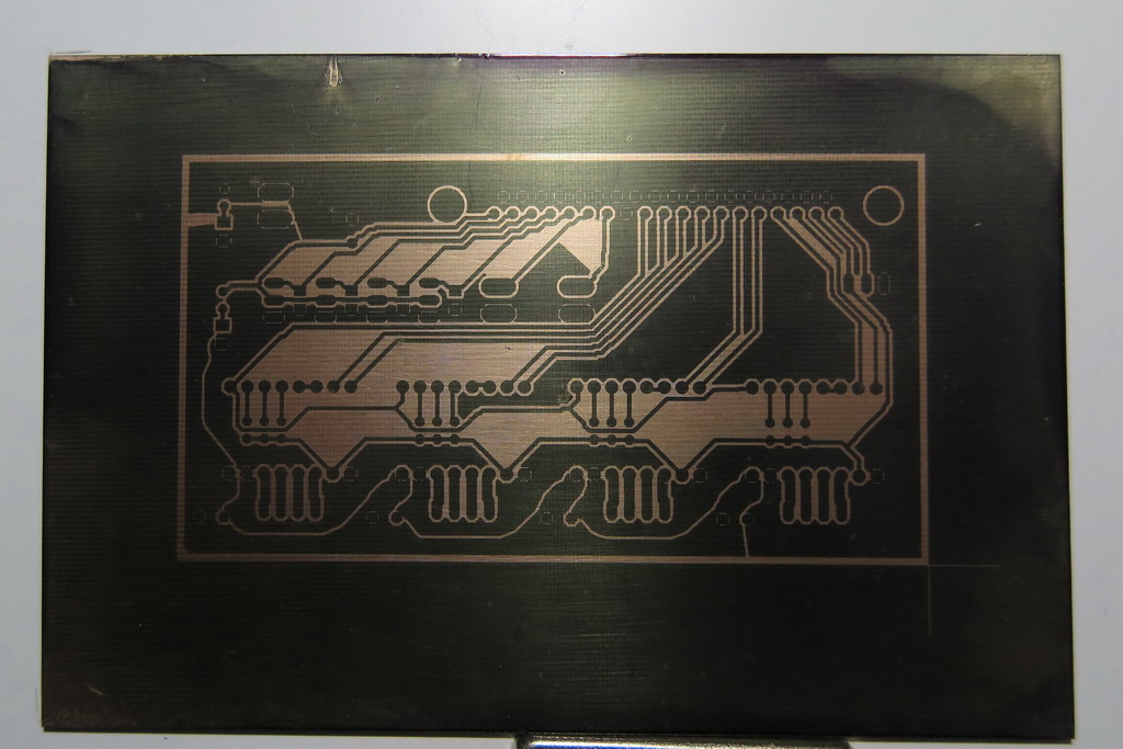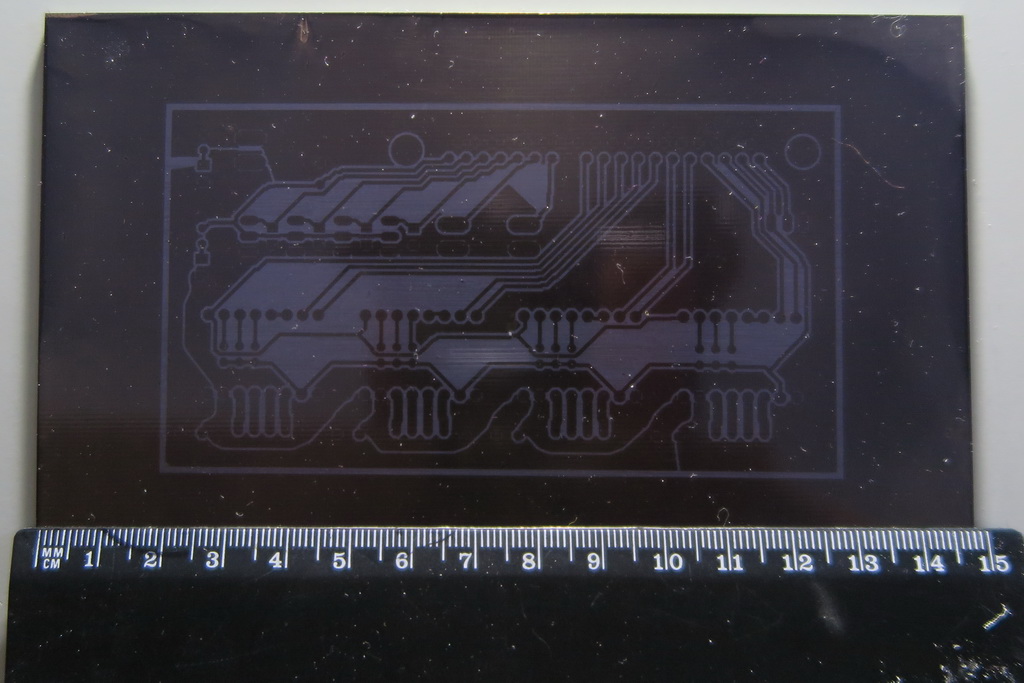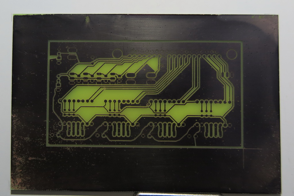 Проявляю (вытравливаю) засвеченные участки в 10% растворе NaOH (Крот, разбавлен 1/5).