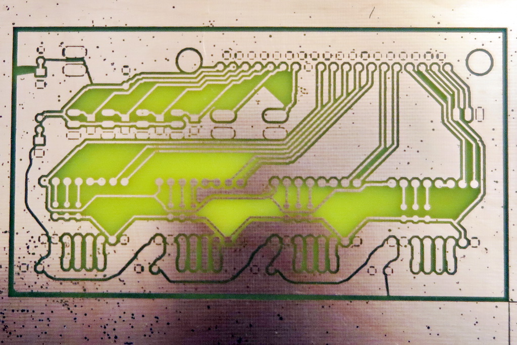 Но фоторезист не обещал мне держаться столько времени. Через поры в нем раствор проникает к меди и образует каверны по всей площади платы. Это безусловный брак