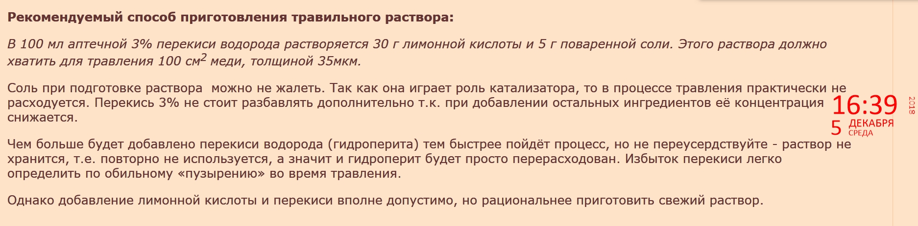 Но она не протравливается полчаса, час... Я увеличиваю концентрацию в 2 раза выше рекомендованной, помогаю кисточкой, но нифига хорошего не происходит. Через полтора часа плата все-таки дотравливается.