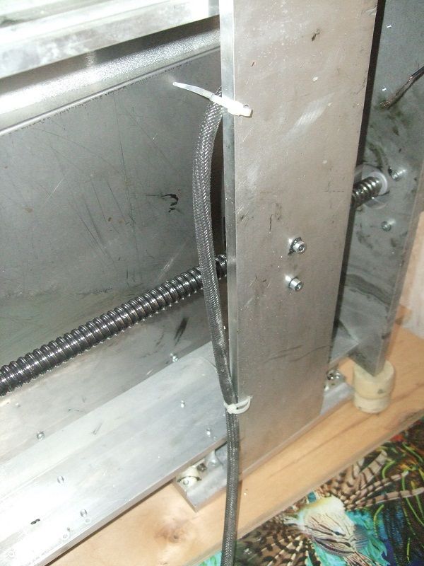 В ходе сборки станок был немного доработан под мои запросы.Добавлен бортик из алюминиевого уголка чтобы стружка не разлеталась,установлен шпиндель водяного охлаждения 800w.Под станину подставлены виброопоры - резиновые отбойники для дверей,куплены в хозтоварах.