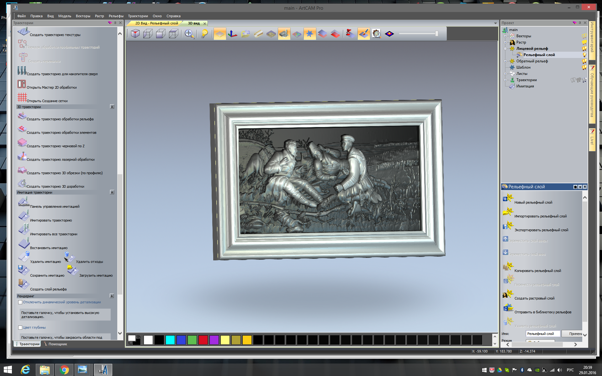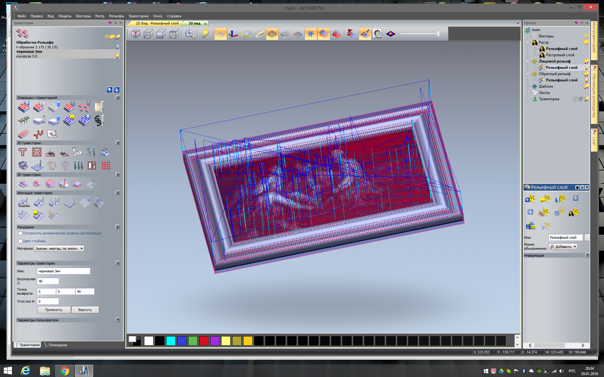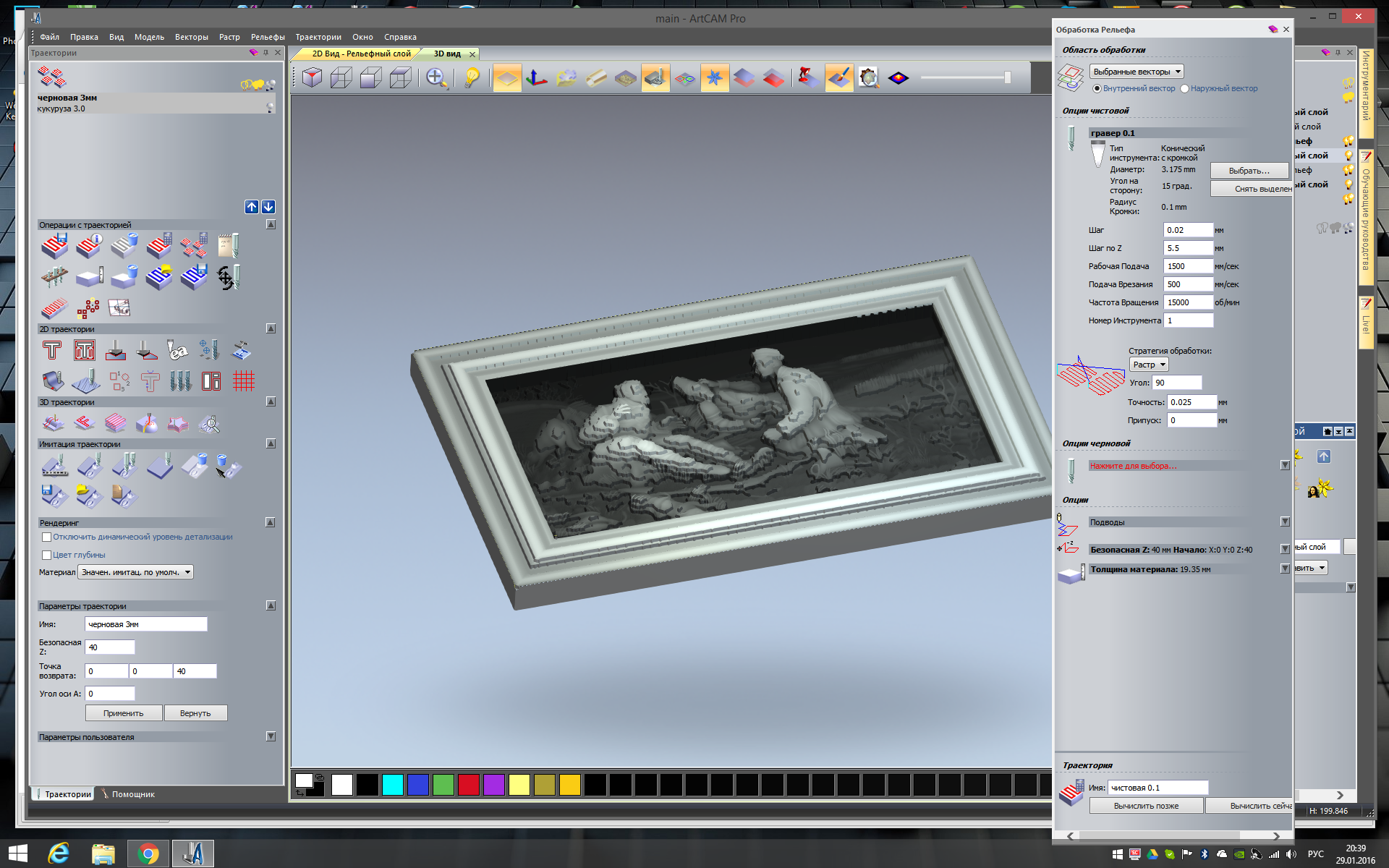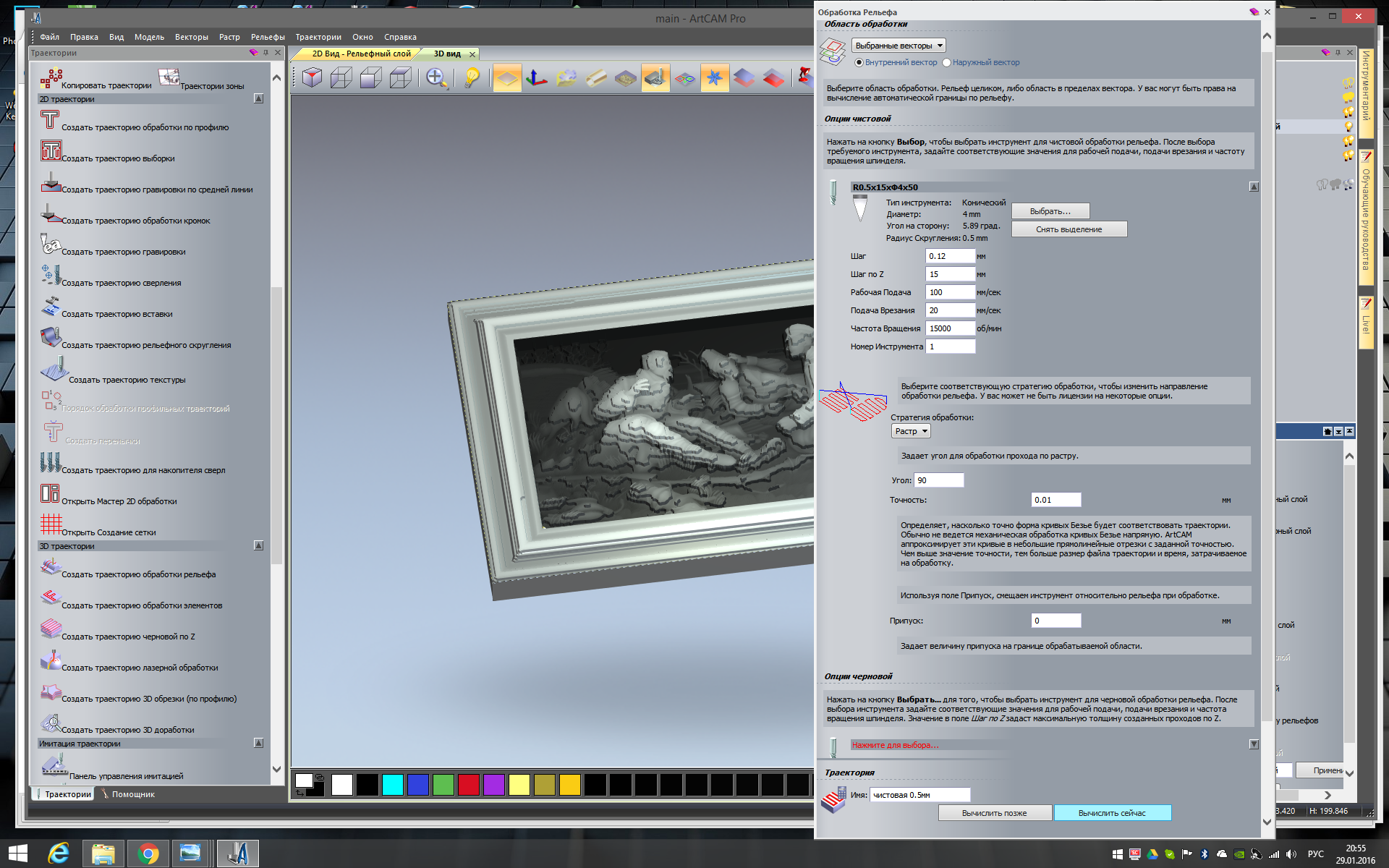 Начитавший кучи информации, поспрашивая у нас на форуме по обработке 3д рельефов на дереве, подготовился и решил попробовать сделать второе изделие по всем советам:) Купил бук, выбрал пано, размеры задал 200x260мм, выбрал черновую фрезу 3.175 однозаходную. Припуск 0.7мм. Чистовую пока все тот же V-гравер 30гр, полка 0.1, шаг 10%, шаг по Z 0.1 (коническая фреза уже заказана). Нажал в арткаме создать траекторию обработки и офигел чуть-чуть. Арткам слопал 9Гб оперативы и расчет идет 1% в 5 минут, без преувеличения! Учитывая, что компьютер нифига не слабенький, то закрались мысли: а может я че-то не так опять делаю.. Ну нереально же столько времени ждать УП для станка!!! И чувствую, что файл УП будет нифига не маленького размера... В общем что не так сделал?:)