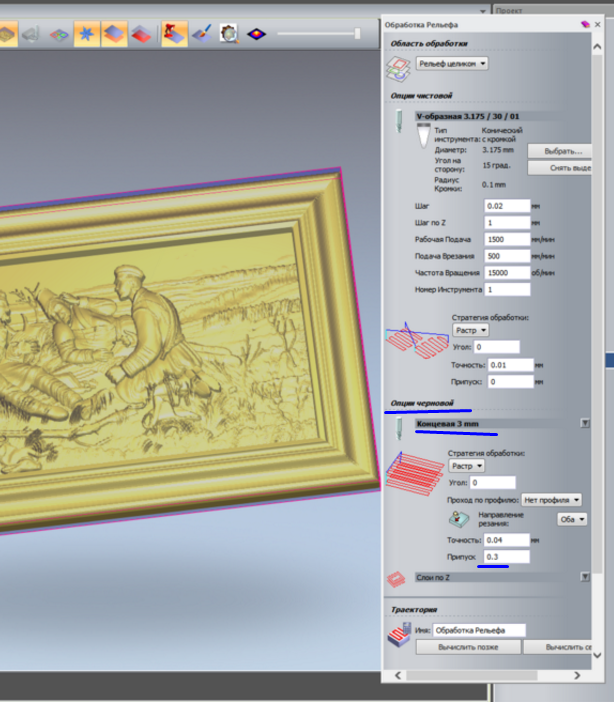 Пишите для черновой обработки концевая 3мм, а вводите данные на свой единственный гравер. Да еще выбираете рельеф целиком. Так не пойдет. Вот скрин для черновой как надо. Внимательно сравните.