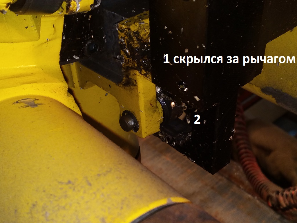 если мы выбрали какой то инструмент он приезжает в нужную позицию и получается что ролик 1 встает напротив окошка чтобы опустится, но положение кармана перехватывает рычаг от пневмо-цилиндра за ролик номер 2
