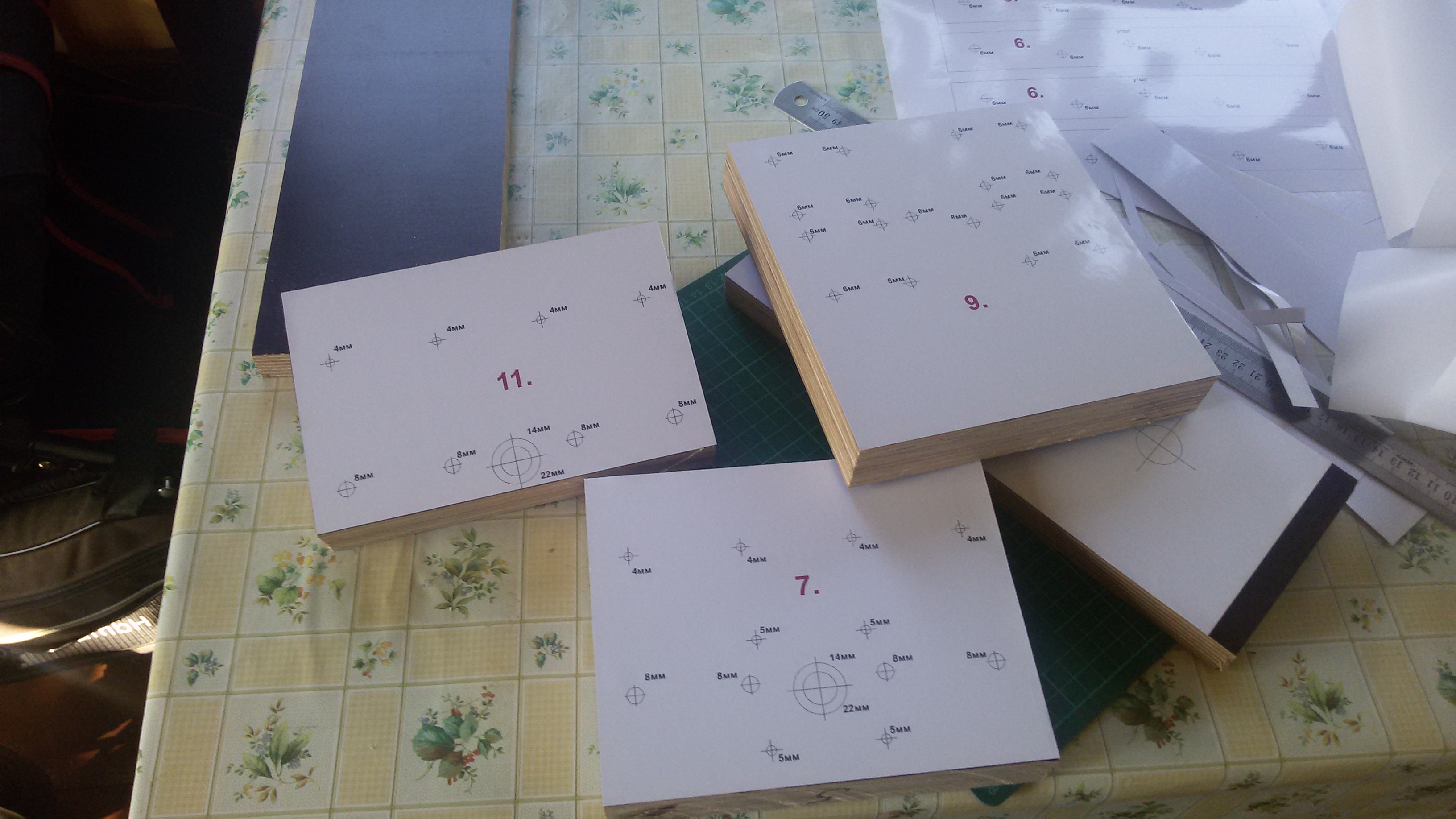 Были нарезаны заготовки из фанеры различной толщины (от 20мм до 50мм). И на них наклеены, распечатанные на принтере на самоклейке, лекала.