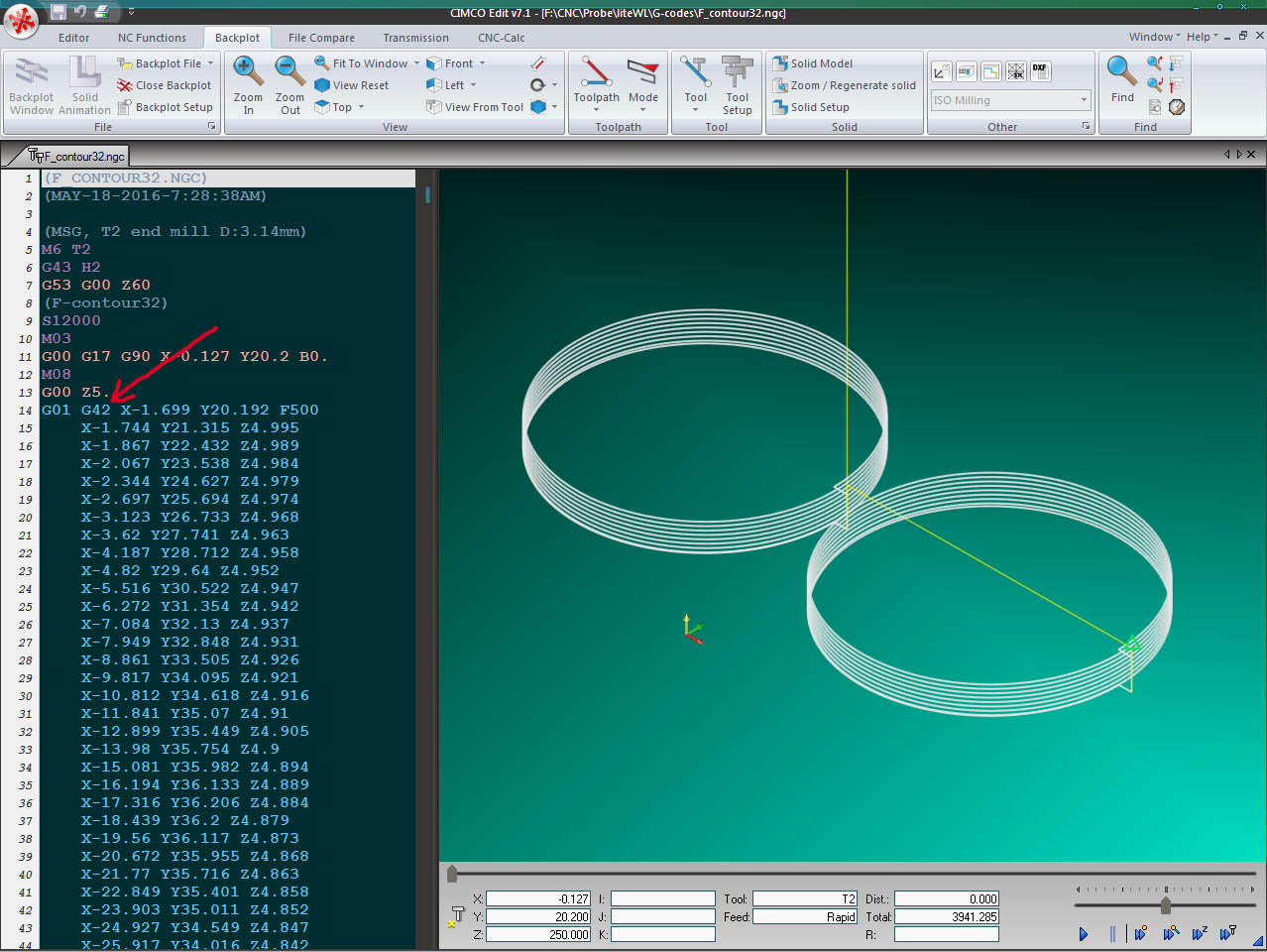 В результате g-code будет дополнен командой динамической компенсации инструмента G42 (для положения инстр. справа) или G41 (инстр. слева), а сама траектория реза будет лежать прямо на контуре, как если бы диаметр инструмента был = 0