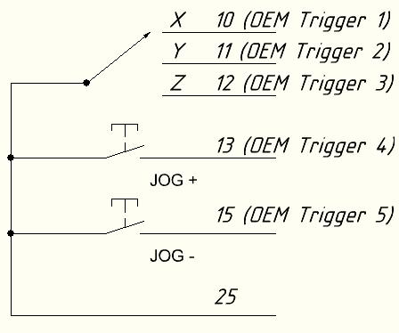 Ну пульте выбирается нужная ось галетным переключателем, затем двумя клавишами перемещаем выбранную ось в + или -. При отпускании клавиши ось должна остановится.