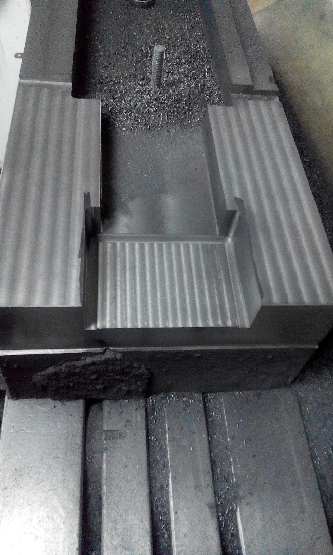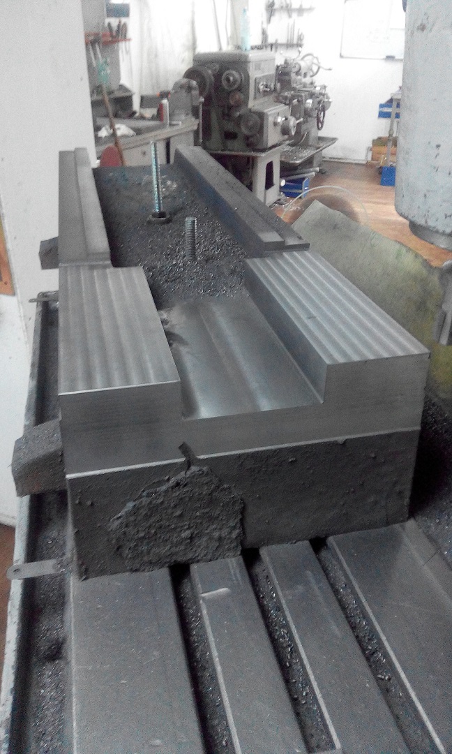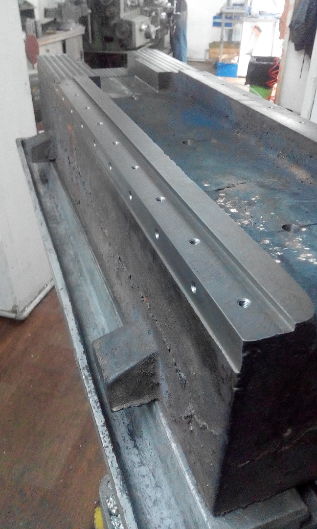Сегодня работал над основанием. Приятный чугун, режется чисто. Обработку под рельсы делали на ИР-500. Место под колонну прогнали также, как и под рельсы, пришлось доработать. Решил поставить серву сзади, где меньше всякой бяки и влаги от СОЖ. Также такая установка дает увеличение длины винта и сильно снижает требования к установке опоры ШВП, т.к. гайка никогда не подъедет вплотную к опоре. Вернее требования она не снижает, но многое прощается и ходить должно, по идее, дольше. Опора под 2 радиальных и 2 упорных подшипа.