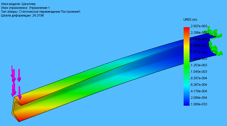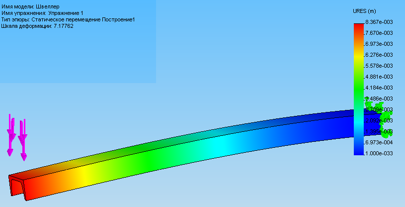 Полученные результаты все-таки похожи на правду – деформация системы стержней более чем на порядок (при нагружении силой 1000Н) превышает деформацию швеллера 5П (ширина 50мм, полка 32мм).