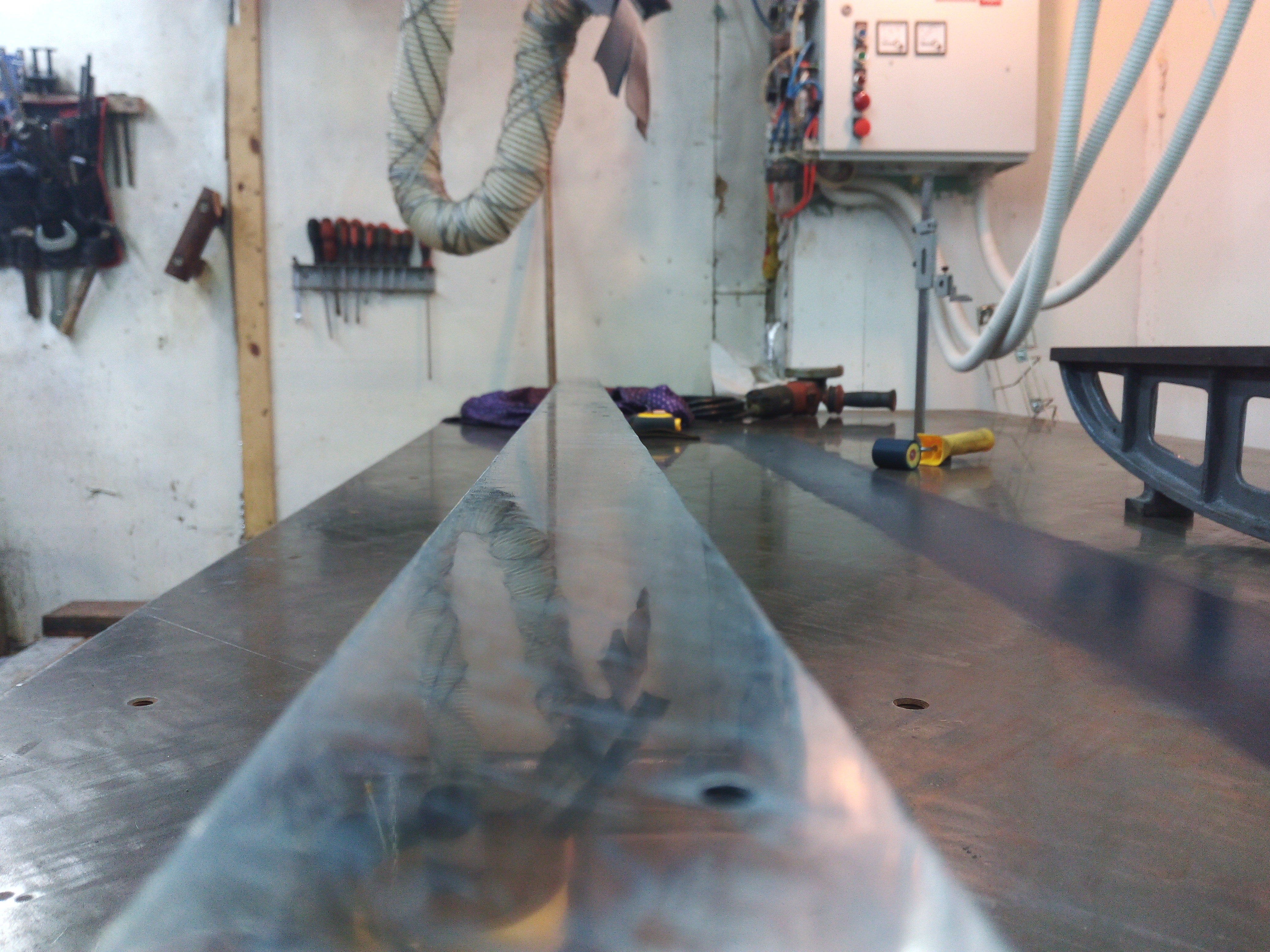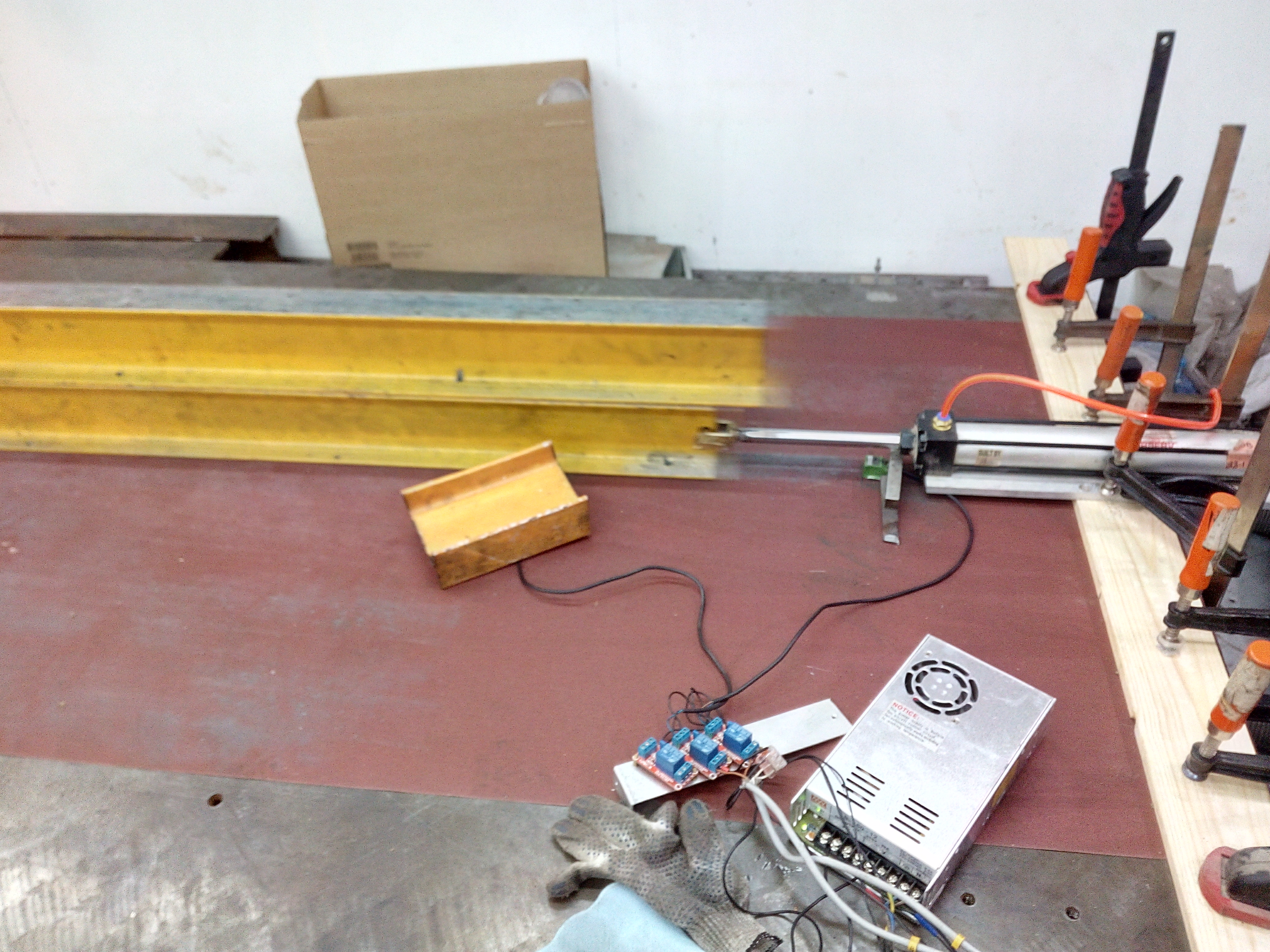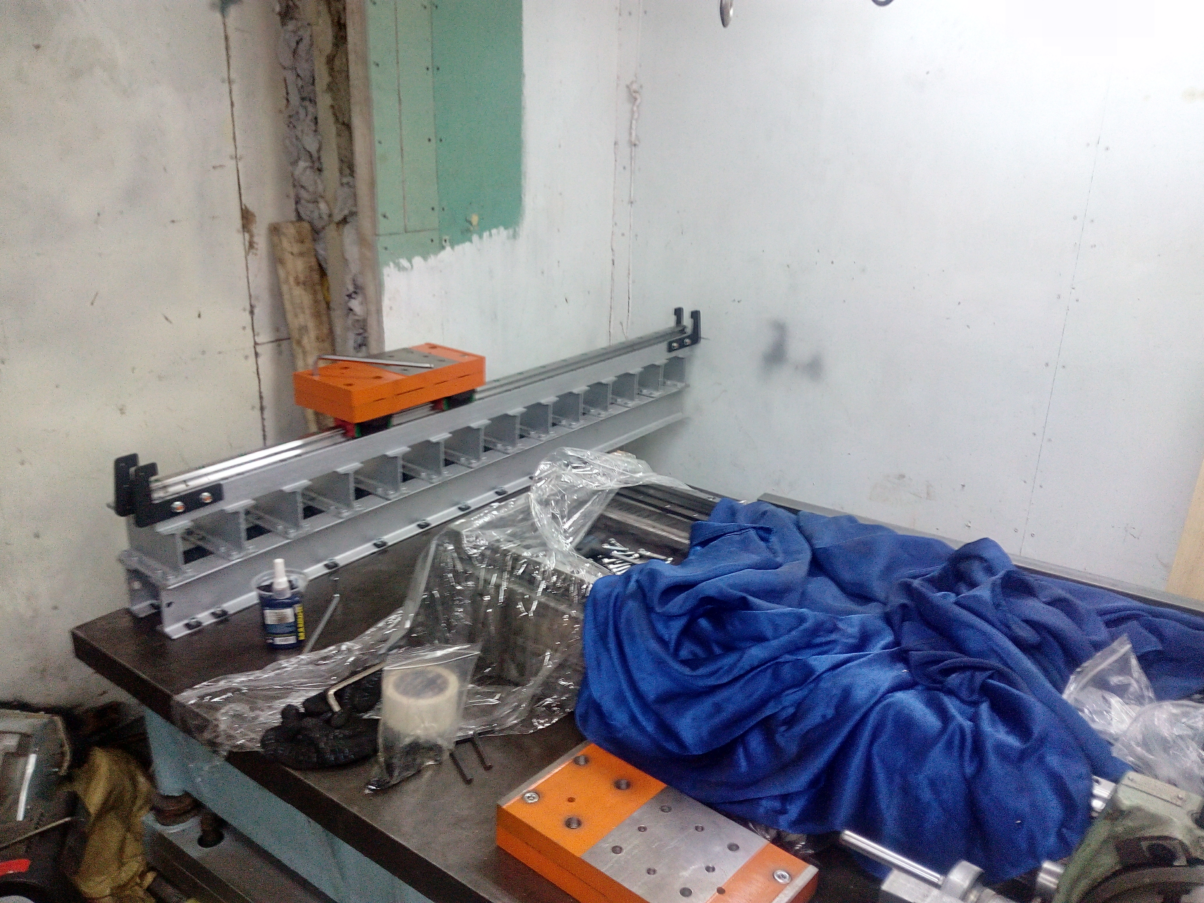 Далее последовало несколько недель проектирования и затем изготовления опор под рельсы. В виду печального финансового состояния пришлось пользоваться тем что нашлось в мастерской. Опоры решил изготовить из двутавровой балки №10 - два параллельных отрезка перекрываются несколькими перемычками, который сверху накрылись 50м квадратом и полосой 10х100. На чертеже все выглядело красиво и просто, но процесс сборки затянулся на долгие недели. В это время я не расставался с болгаркой и масляной краской, затем к этому набору прибавилась наждачная бумага, пневмоцилиндр и измерительная стойка. Все детали в черновую выводились болгаркой на краску, затем все дотиралось на наждачной бумаге уложенной на плите.