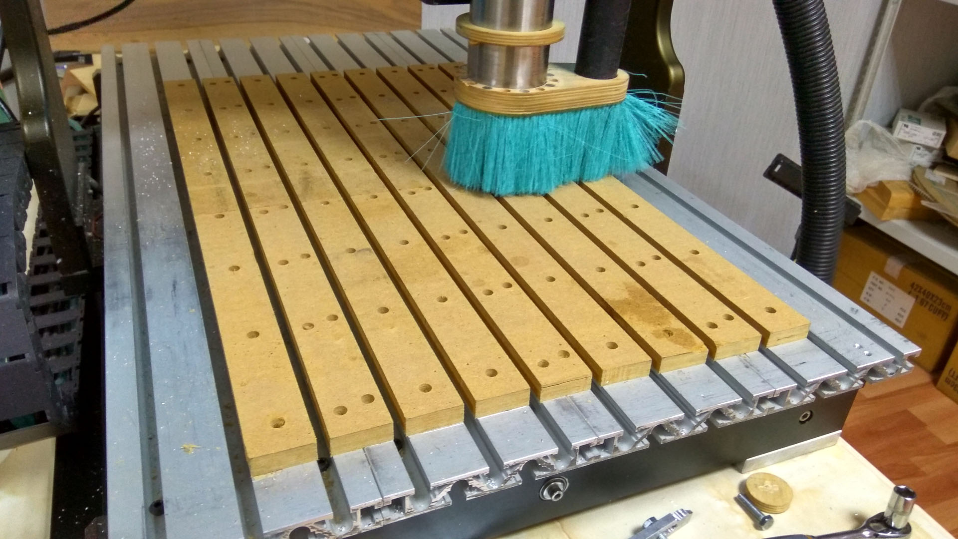 Не, дерево не пойдет: к нему плохо липнет двухсторонний скотч и заготовка "едет". Обильно поливаю заготовкой водичкой - дерево разбухает. + на т-пазах удобные крепления заготовки. Так что нужен стол ровный:)