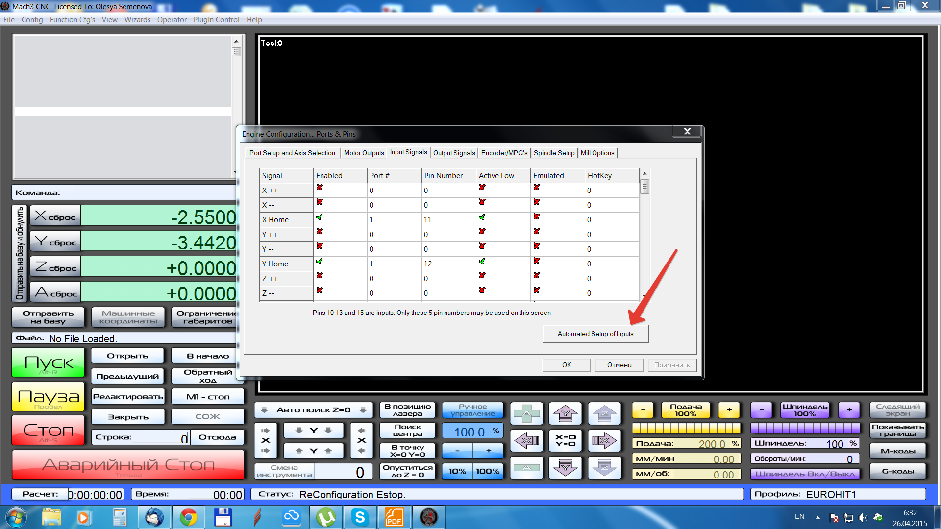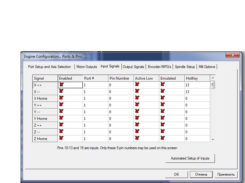 Mach под рукой сейчас нет, но там есть авто настройка входящих сигналов, смотрите справку по настойкам. Суть такова