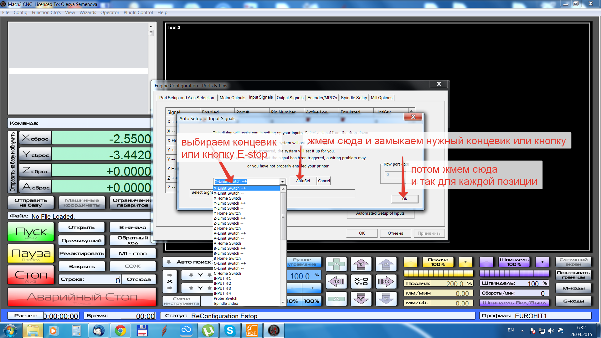 Повторяю Mach под рукой нет, читайте хелп! Эта система наиболее разжевана и в русском и иностранном инете! Зайдите в настройки лимитов и установите расстояние на сколько система должна съезжать с концевиков при наезде на них!