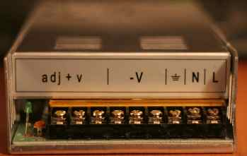 чуть далее расположена надпись "adj" - это обозначение регулятора выходного напряжения (можно покрутить отвёрткой и немного подрегулировать выходное напряжение)
